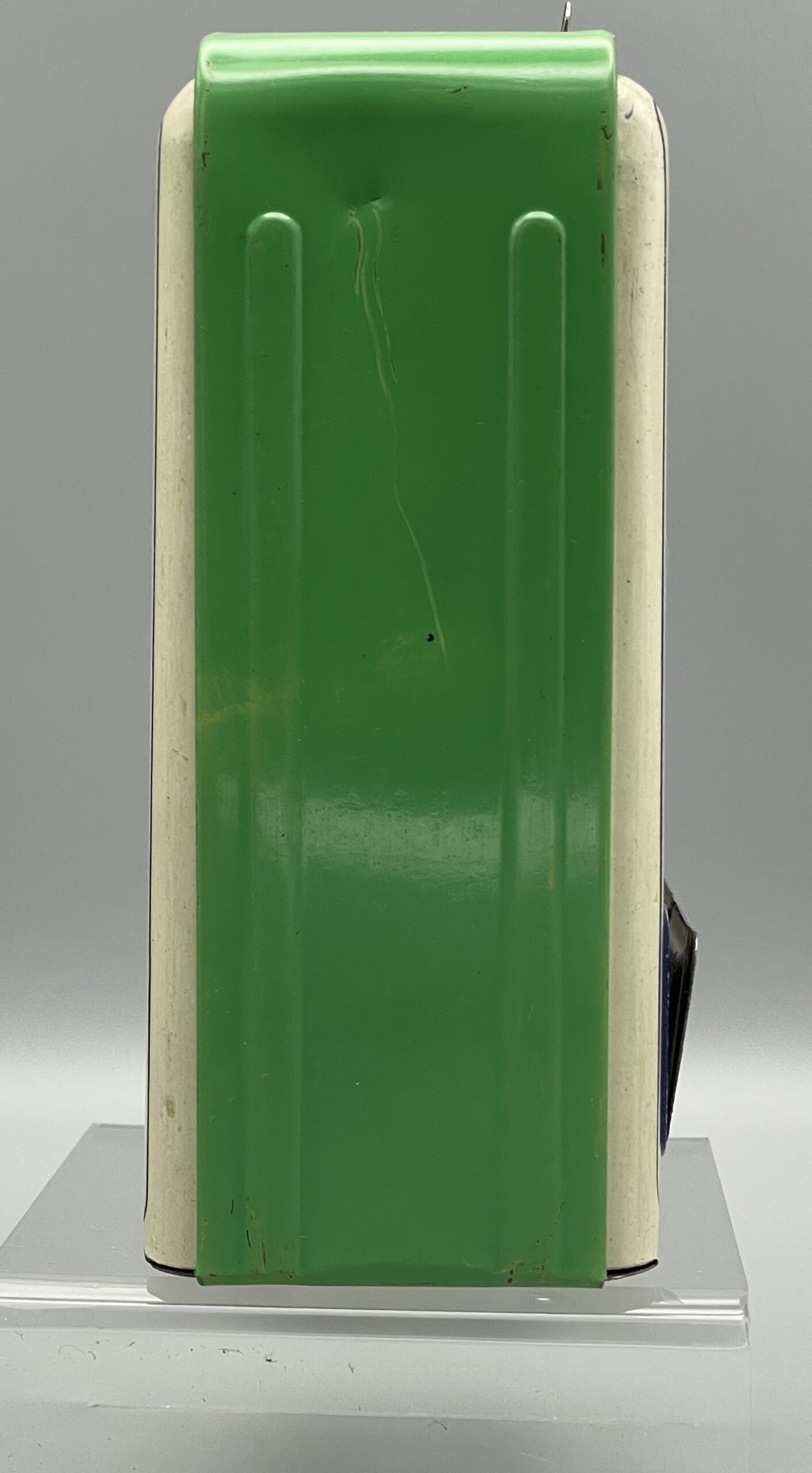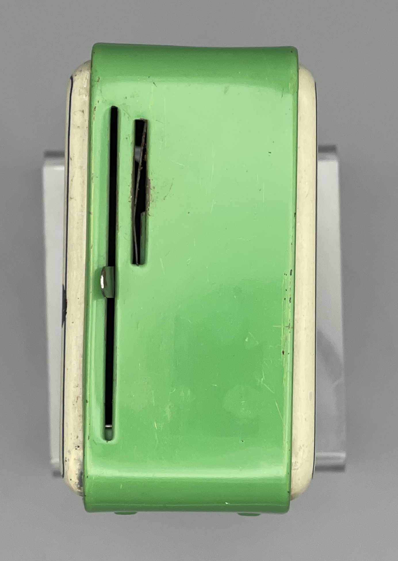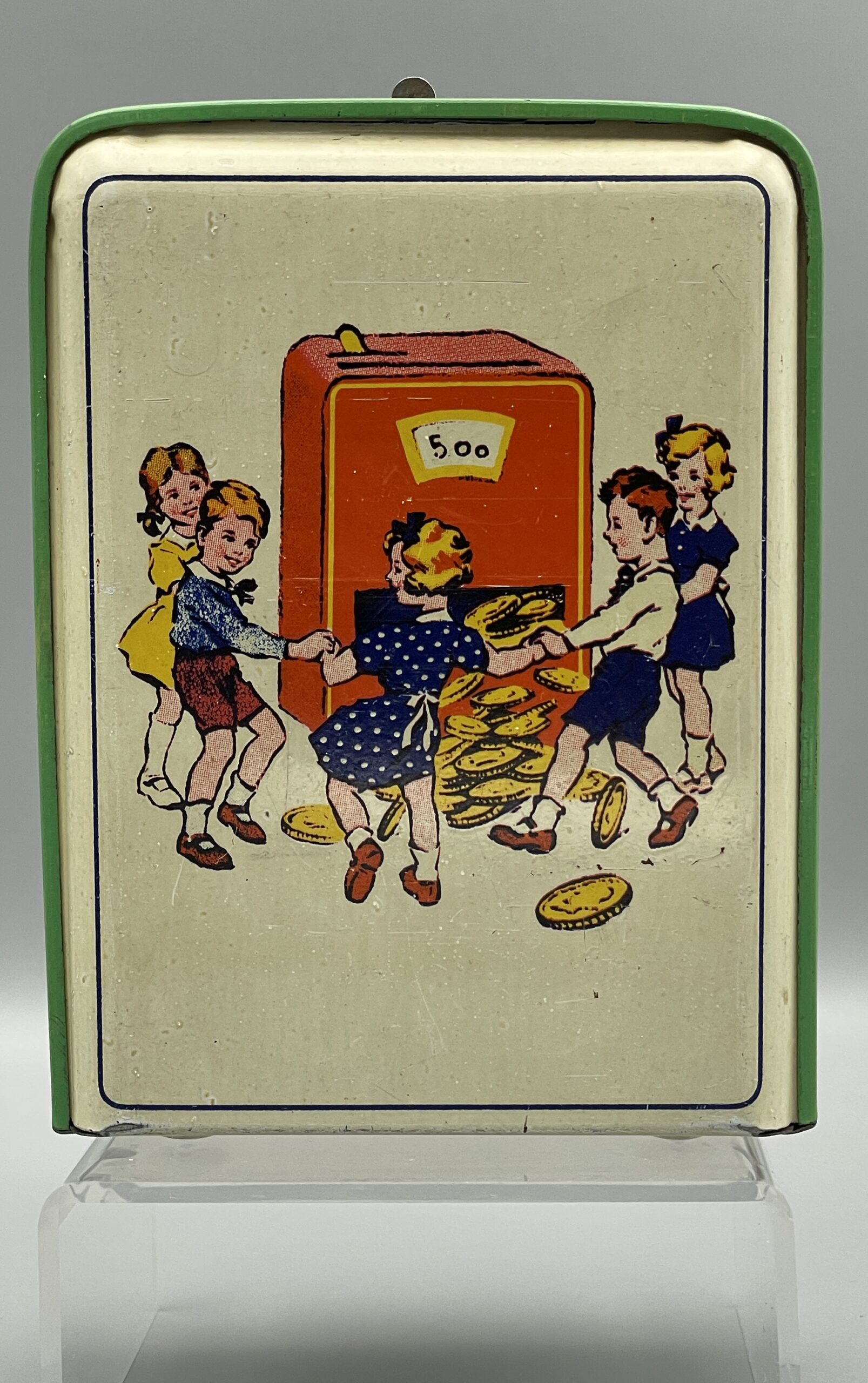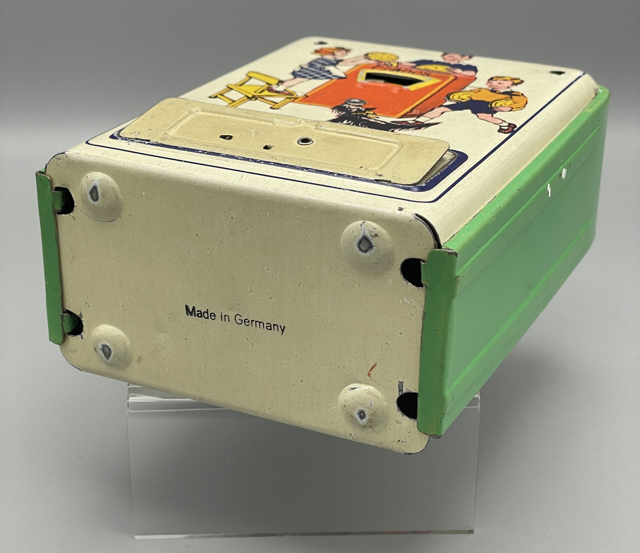 Attraktive und selten gut erhaltene Spardose aus lithografiertem Bleck, hergestellt in den 1930er Jahren von GEOBRA für den französischen Markt. Länge 10, Breite 5, Höhe 13 cm.