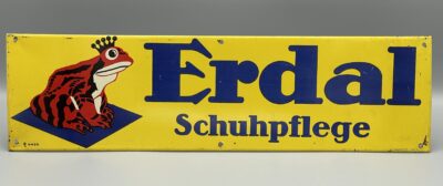 Altes Original Reklameschild mit Werbung für die Schuhpflege-Produkte von Erdal. Blechschild mit dem Rotfrosch, um 1930. Sogenannter Tür- oder Tresenstreifen. Sehr schöner Zustand! Siehe Bilder.