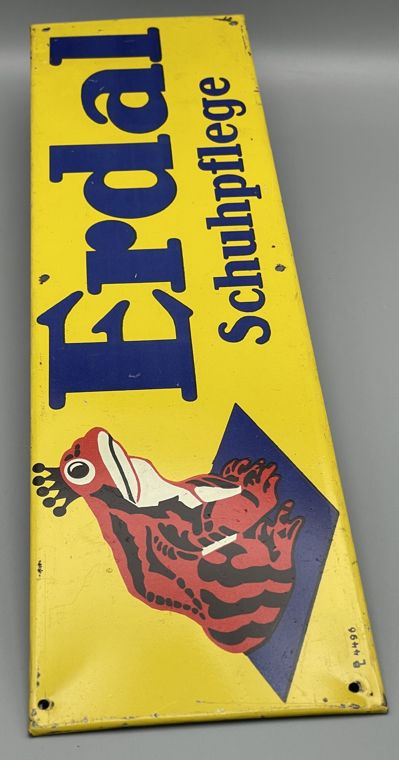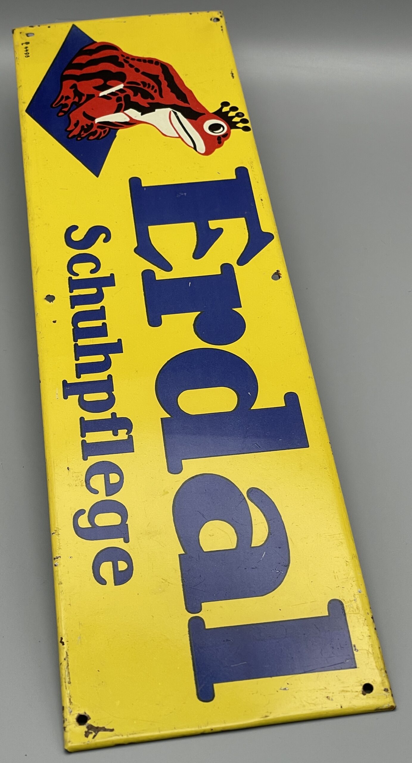 Altes Original Reklameschild mit Werbung für die Schuhpflege-Produkte von Erdal. Blechschild mit dem Rotfrosch, um 1930. Sogenannter Tür- oder Tresenstreifen. Sehr schöner Zustand! Siehe Bilder.