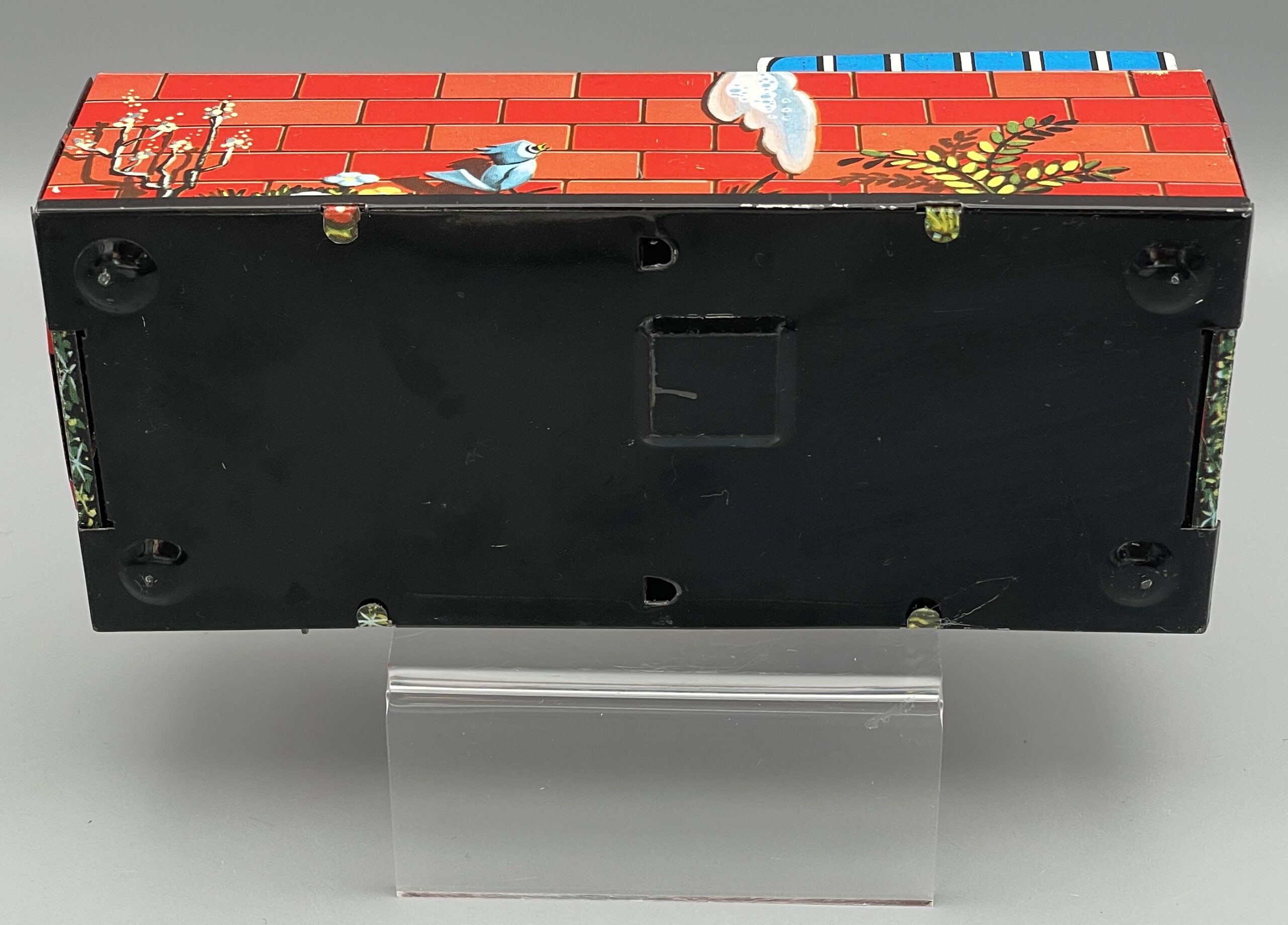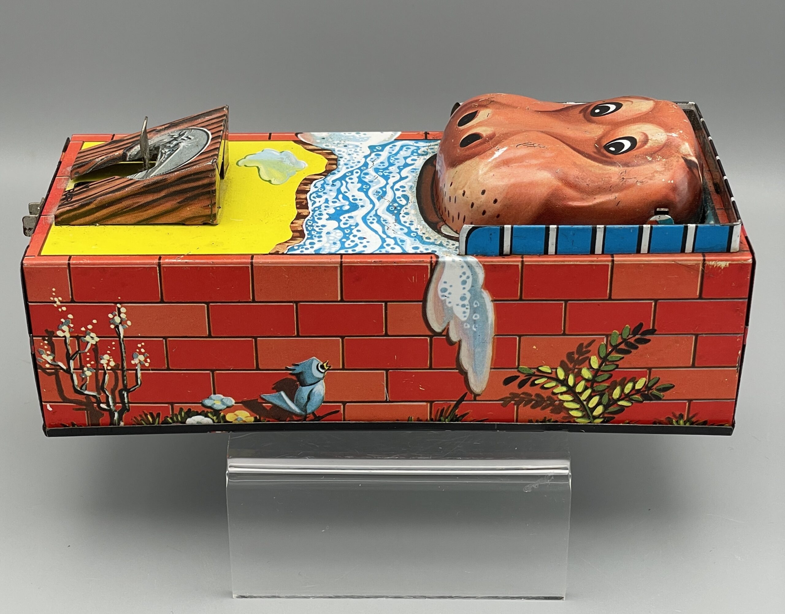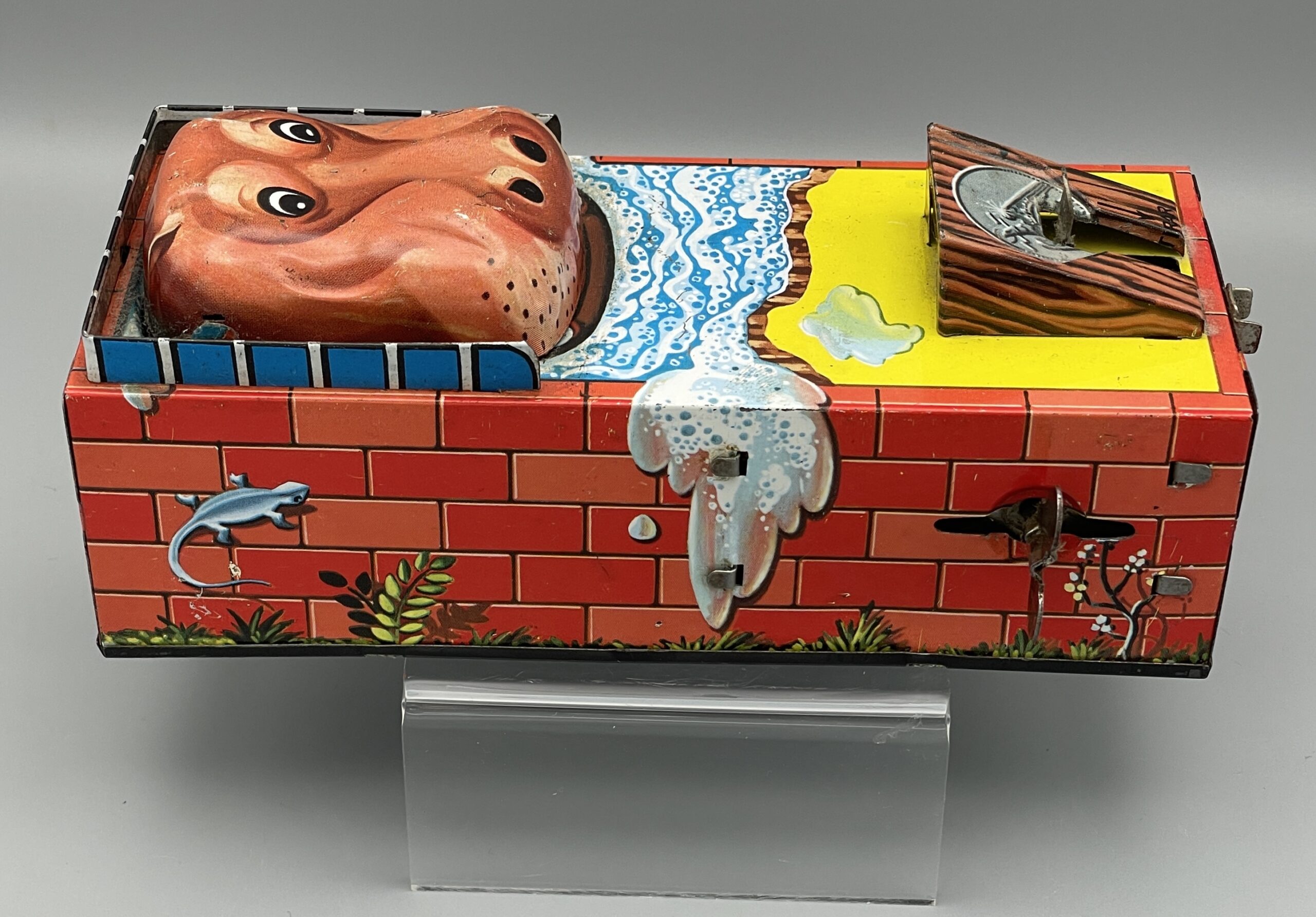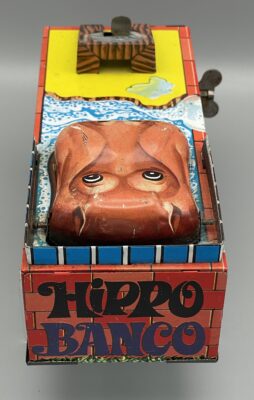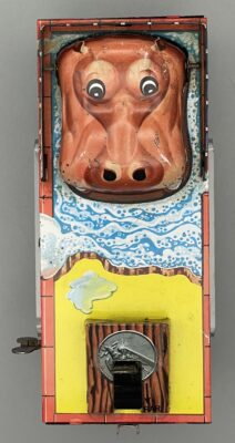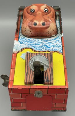 Seltene mechanische Blechdose aus Japan, 1960er Jahre. Nilpferd öffnet den Mund, wenn man eine Münze auf die Mechanik legt (siehe Video), die Münze fliegt dann – mit etwas Glück – dem Tier ins Maul!