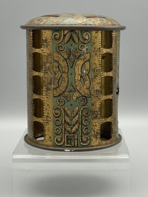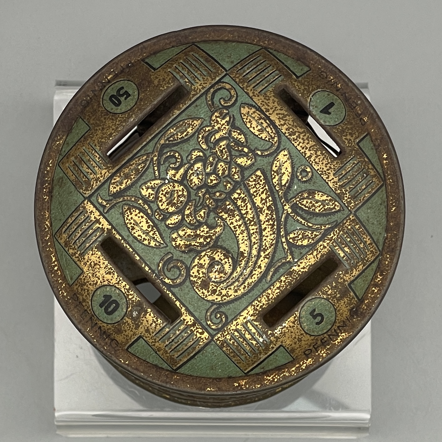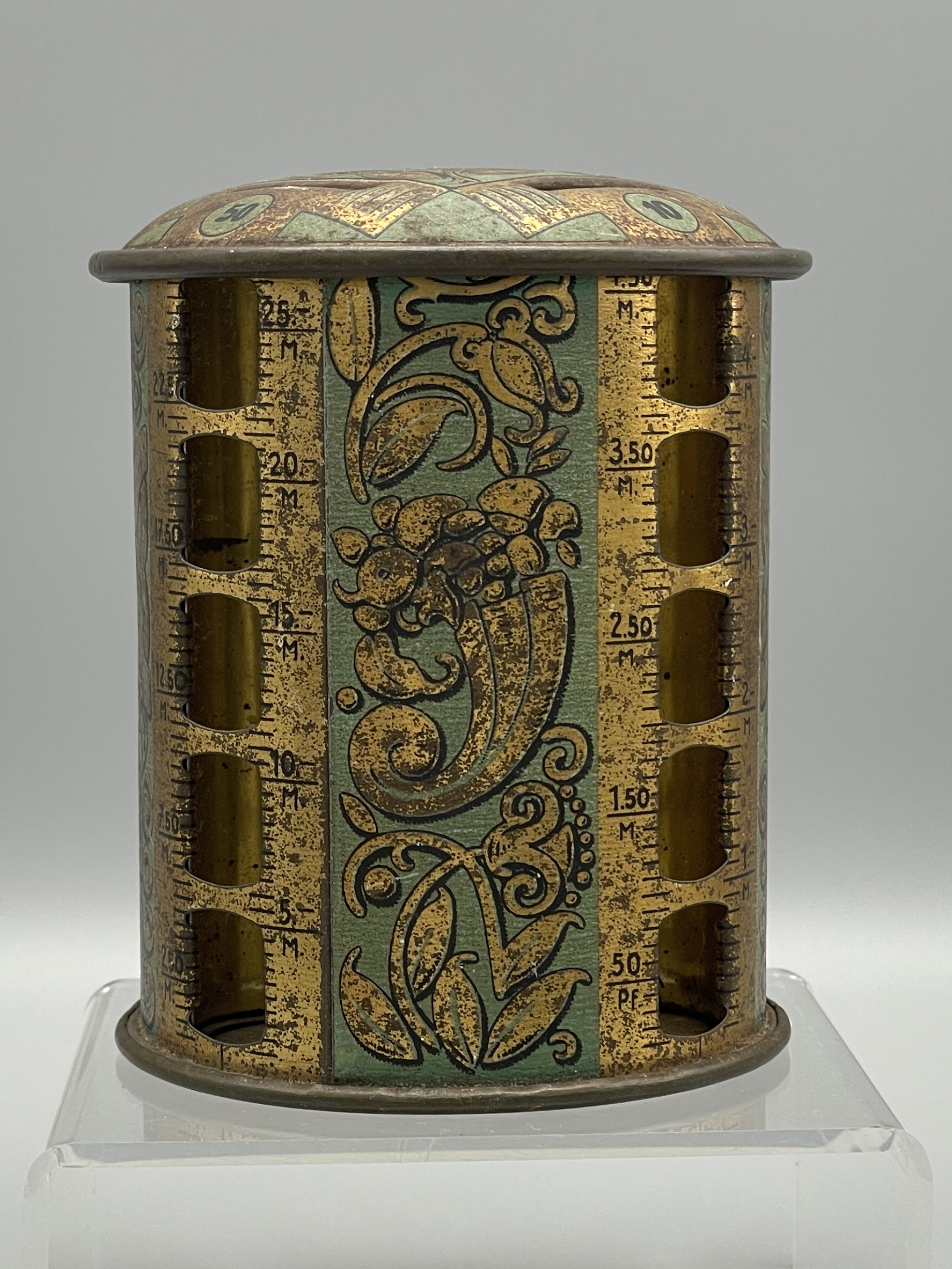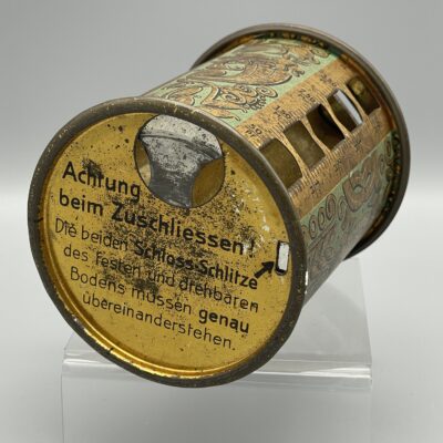Seltene Spardose aus Blech mit Jugendstilmotiven. Vier verschiedene Einwurf-Schlitze für die vier Säulen zu 1, 5, 10 und 50 Pfennig. Ca. 9 cm hoch. Altersgemäßer Zustand mit Gebrauchsspuren. Siehe Bilder.