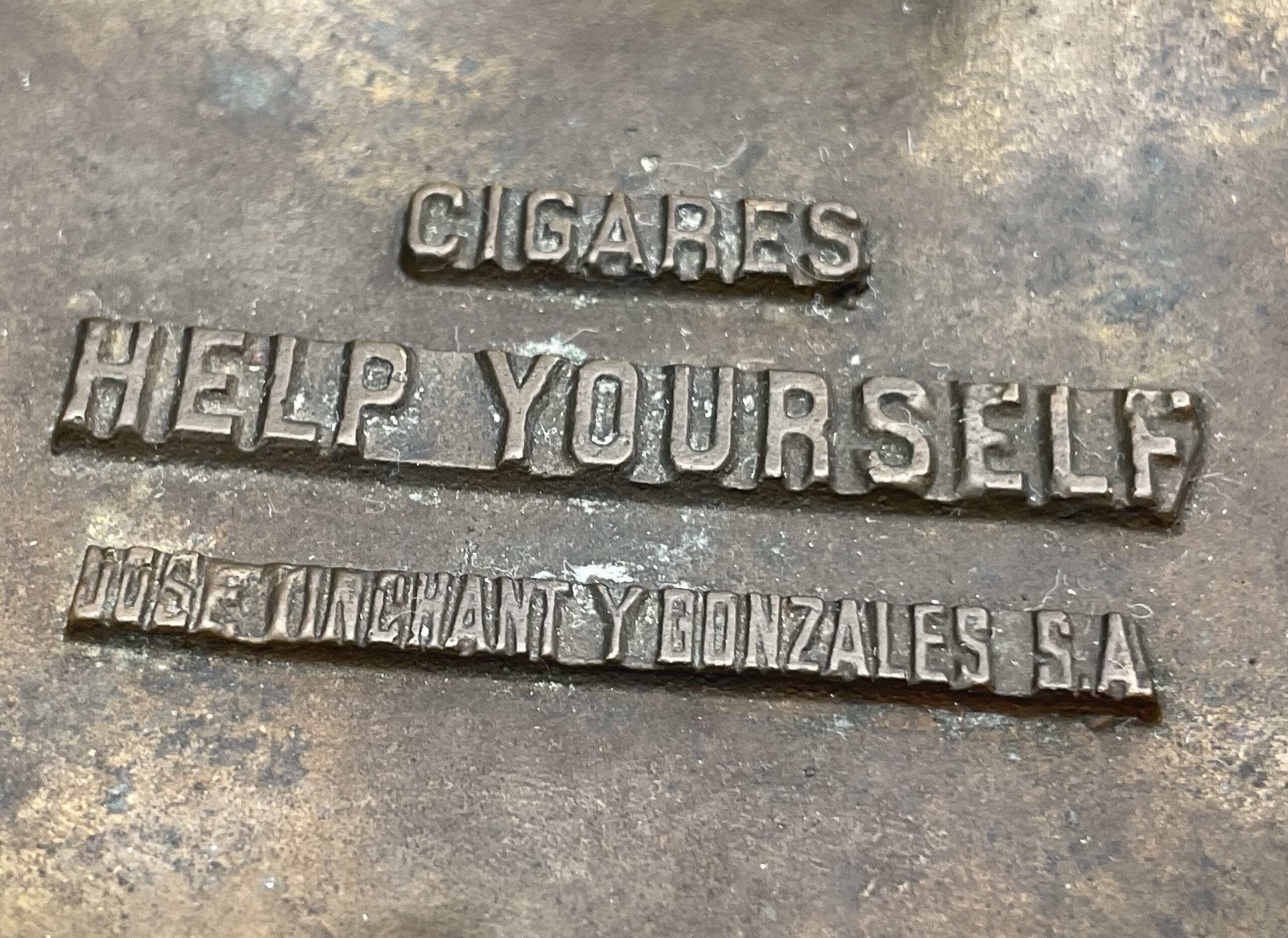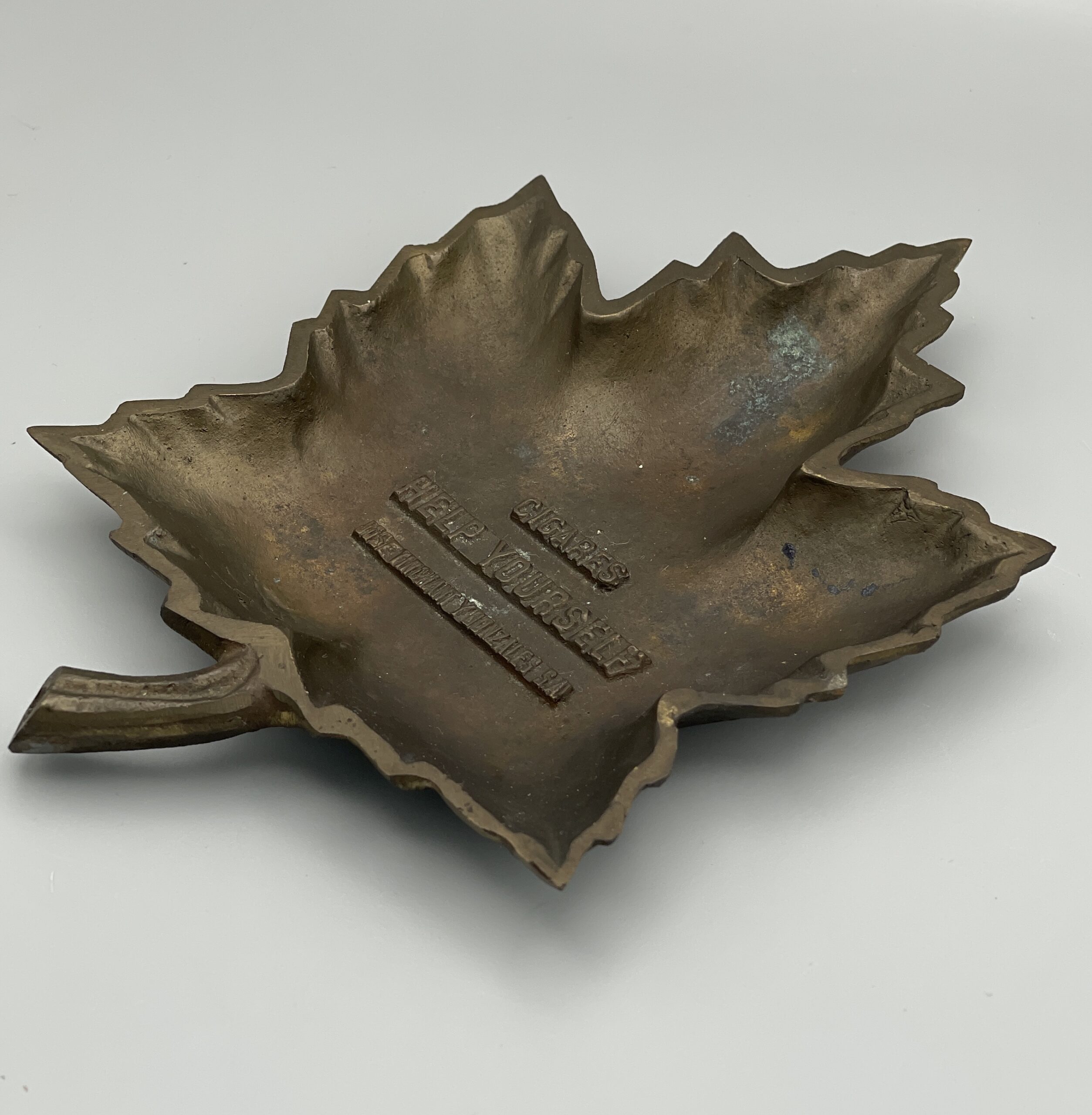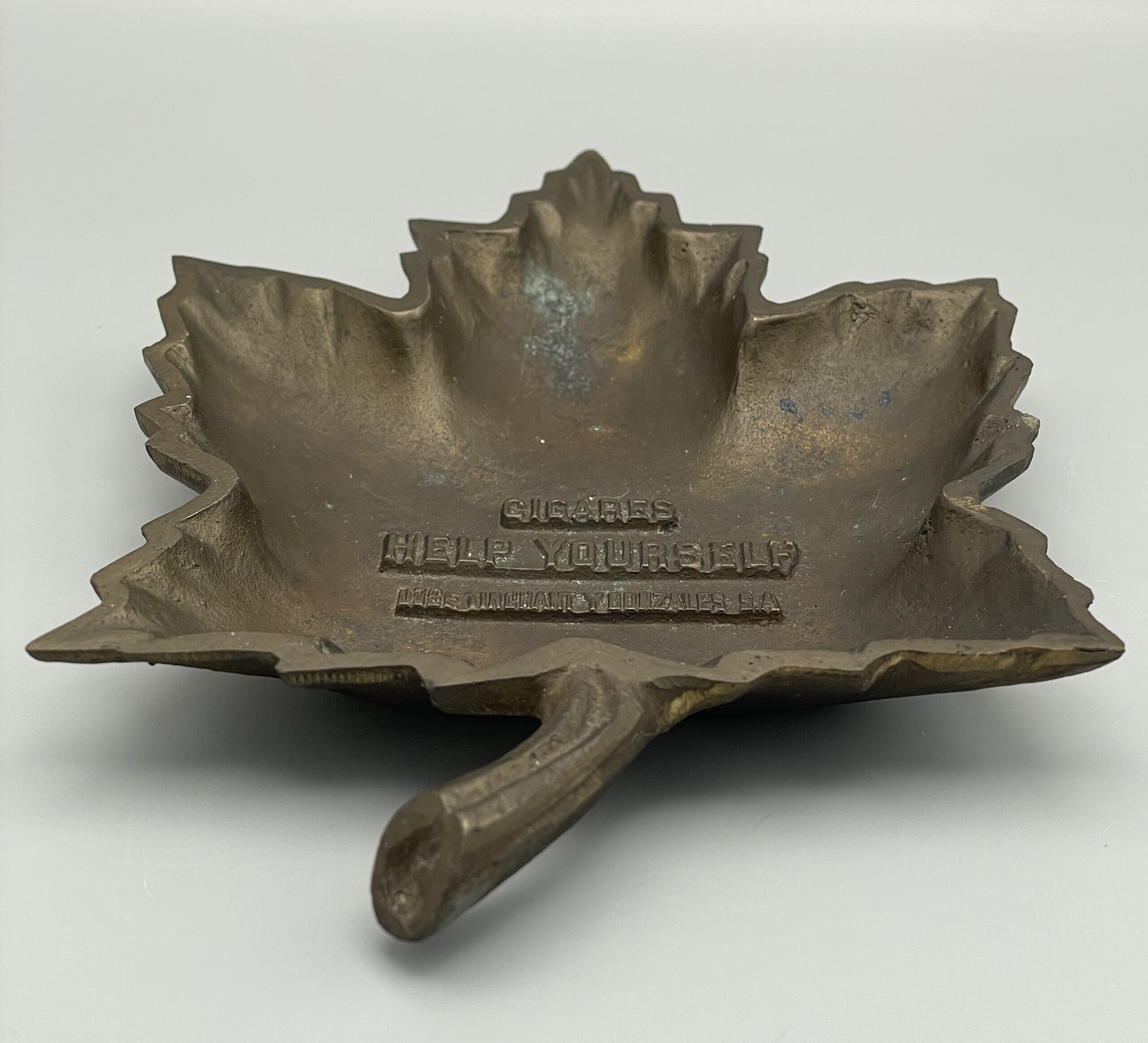 Seltener, uralter und schwerer Ascher in Form eines Ahornblattes aus Messing oder Bronze. Wohl um 1930. Reklame für die Zigarren Marke HELP YOURSELF aus der Tabakmanufaktur José Tinchant y Gonzalès & Cie aus Antwerpen, mit ab 1899 auch einer Niederlassung in Luxemburg-Bonneweg.