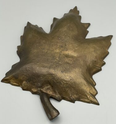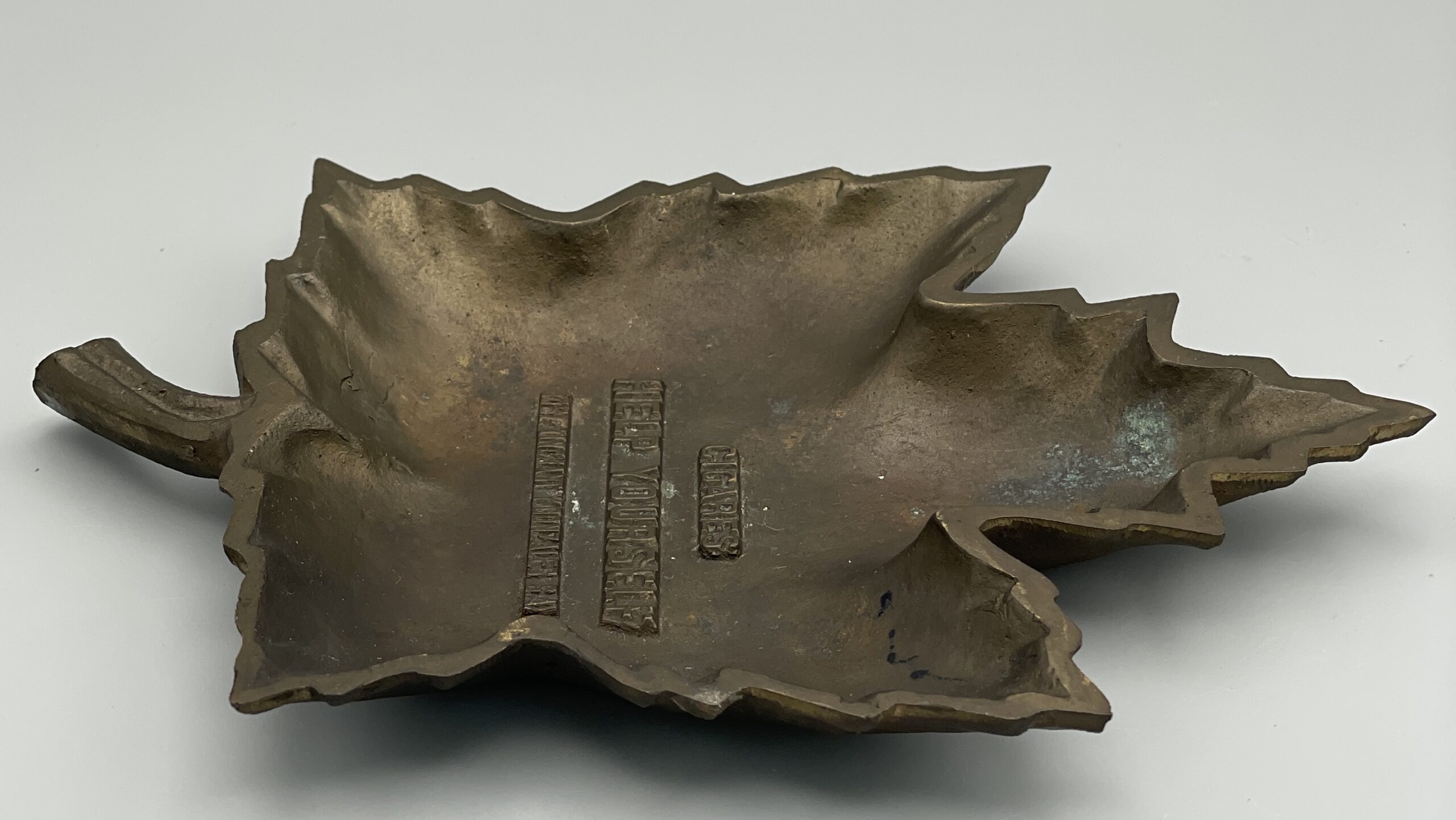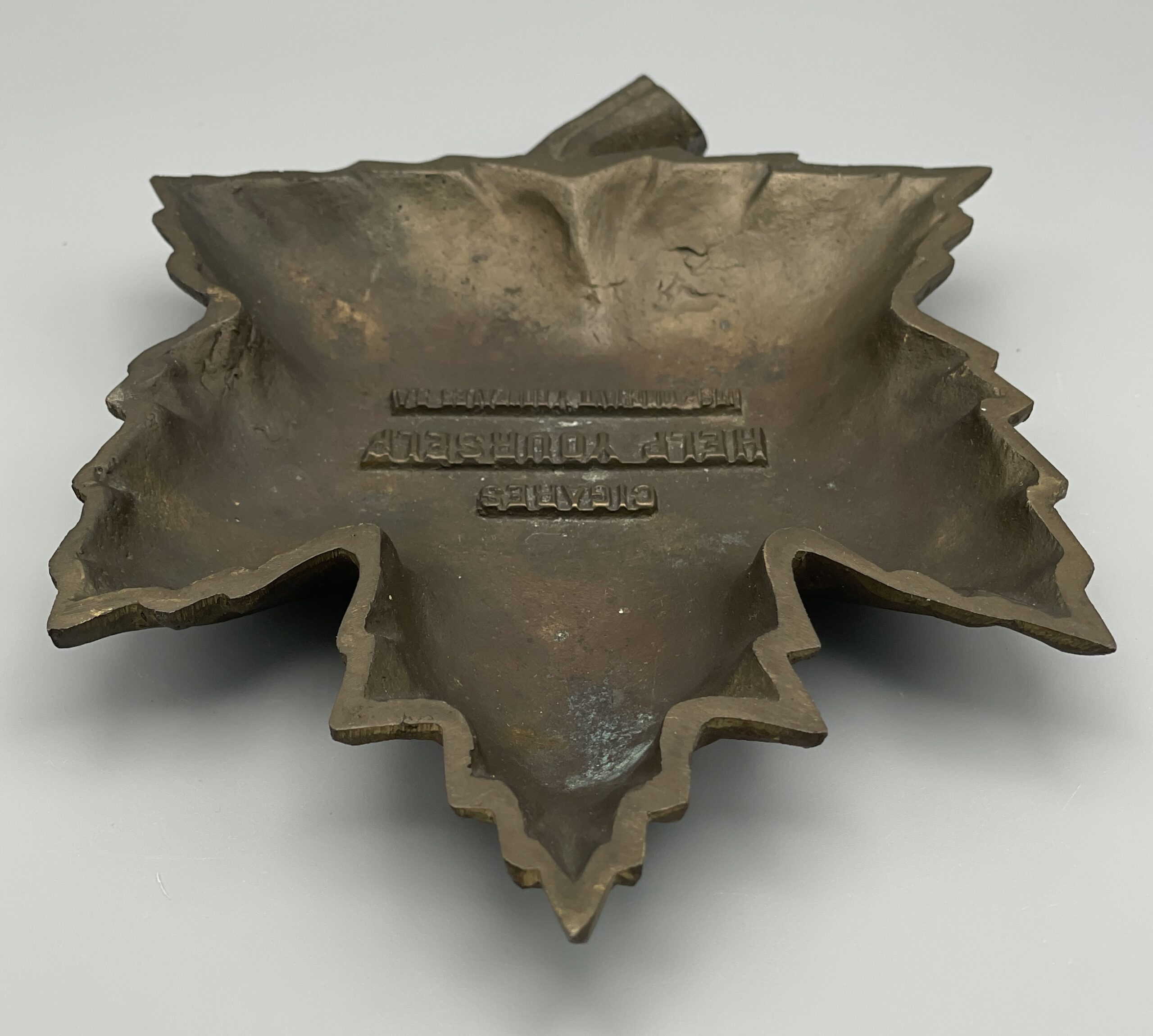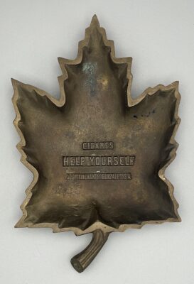 Seltener, uralter und schwerer Ascher in Form eines Ahornblattes aus Messing oder Bronze. Wohl um 1930. Reklame für die Zigarren Marke HELP YOURSELF aus der Tabakmanufaktur José Tinchant y Gonzalès & Cie aus Antwerpen, mit ab 1899 auch einer Niederlassung in Luxemburg-Bonneweg.