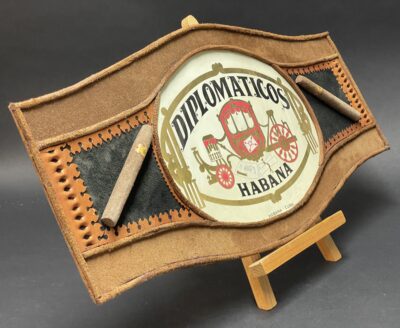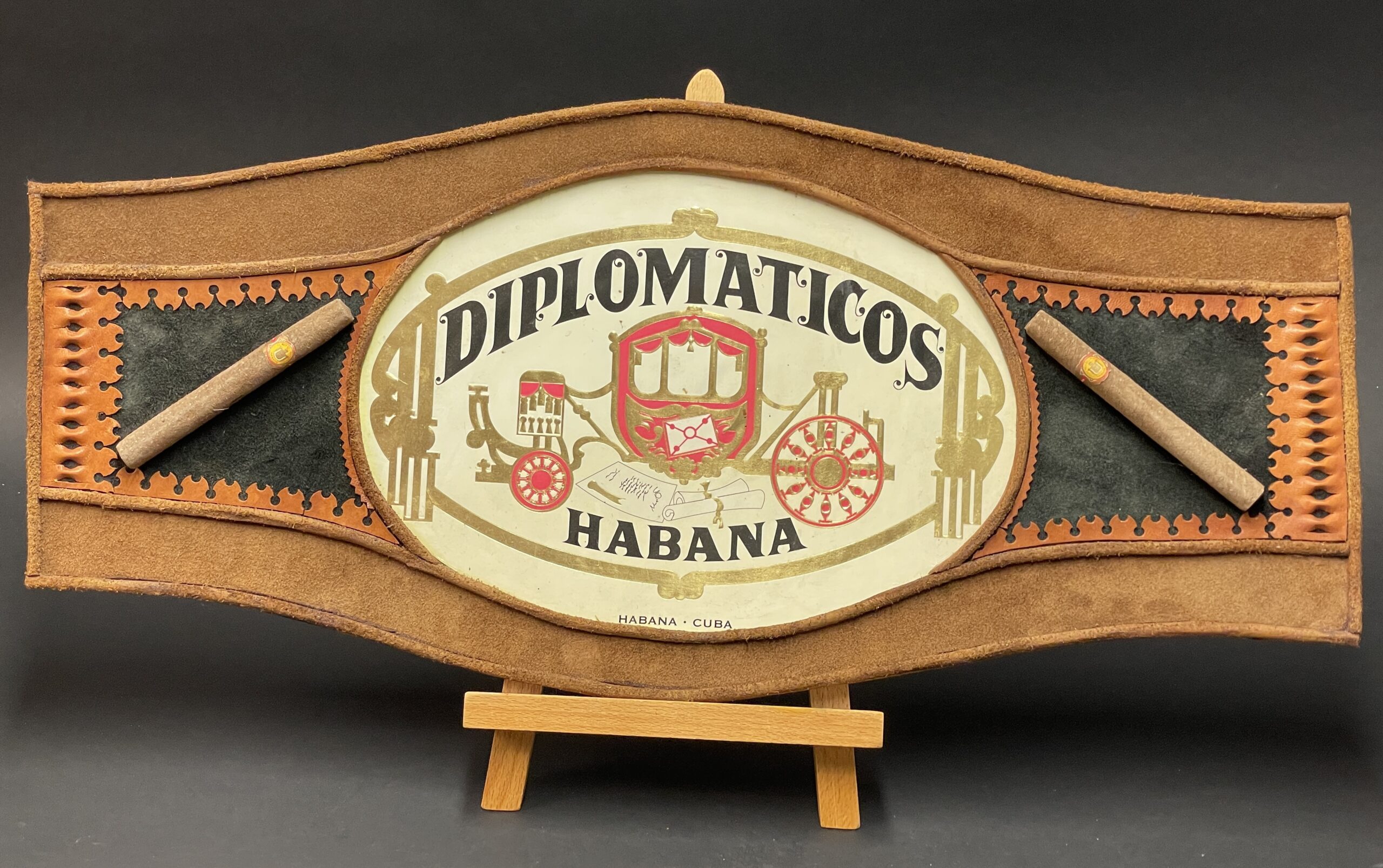 Sehr seltenes Reklameschild für die Havanna-Zigarren der Marke DIPLOMÁTICOS, um 1970. Das dreidimensionale Schild besteht aus verschiedenen Materialien, u.a. Pappe und/oder Leder, resp. Stoff.