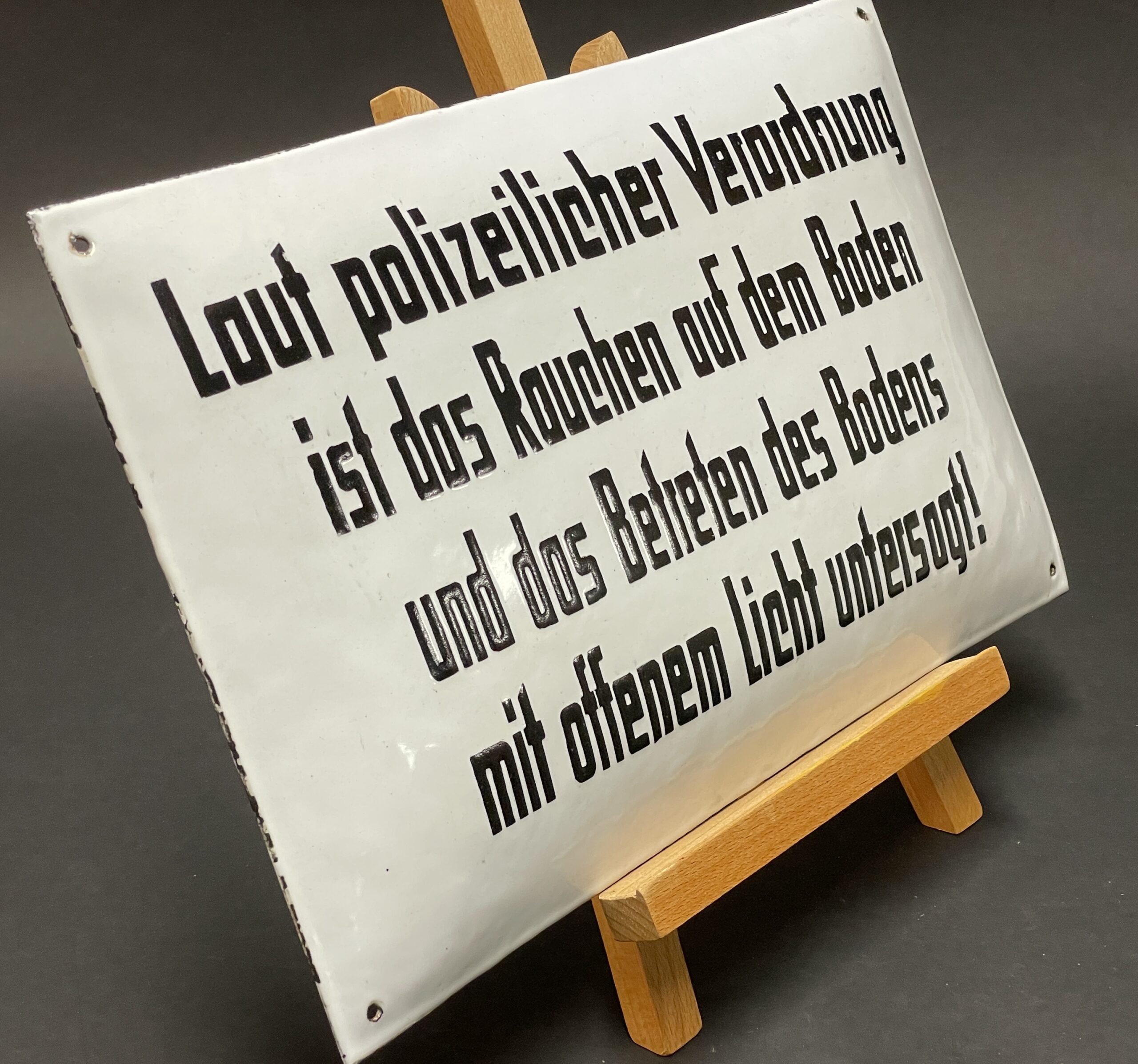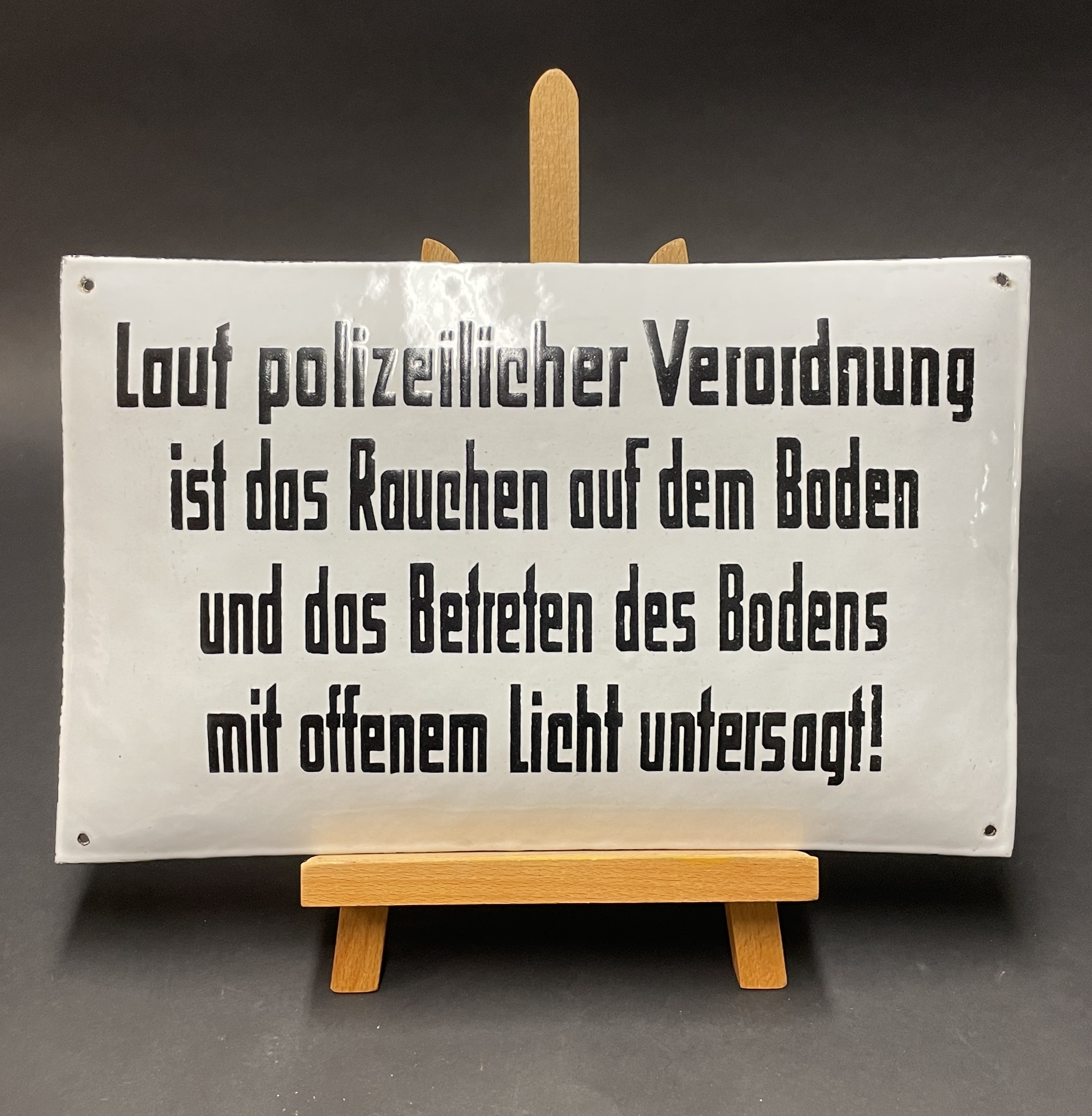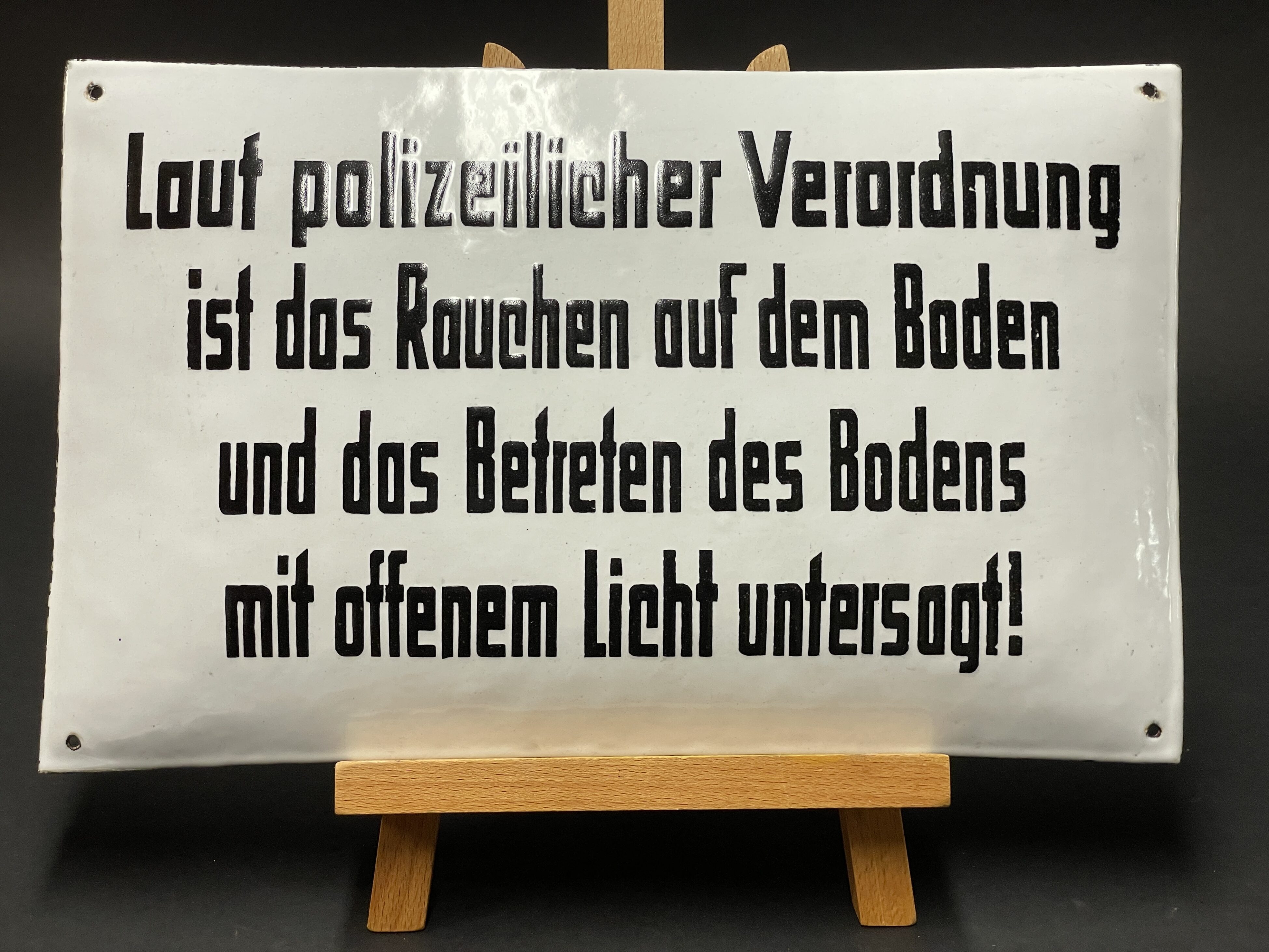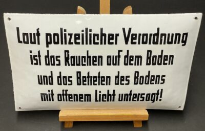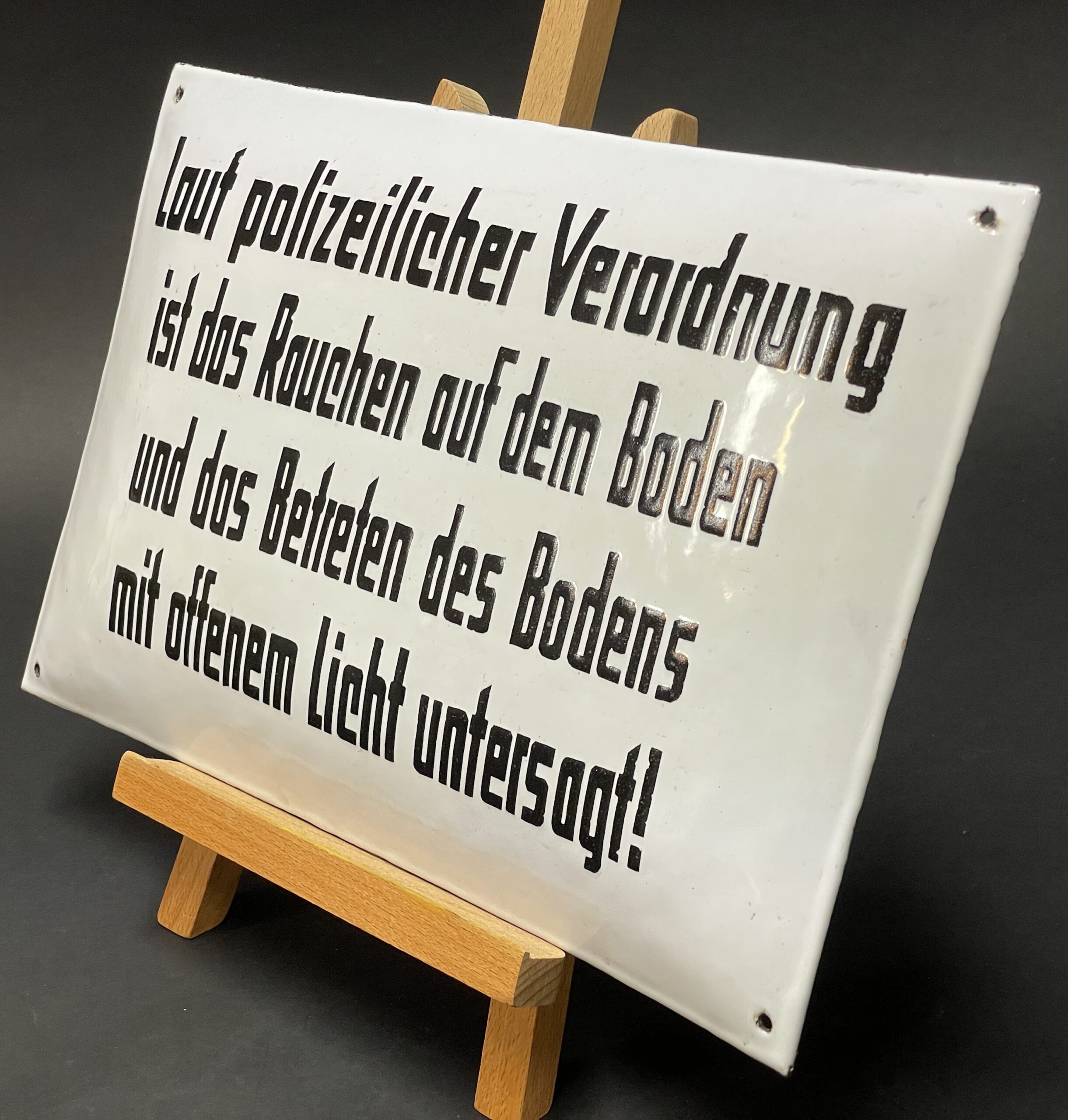 “Laut polizeilicher Verordnung ist das Rauchen auf dem Boden und das Betreten des Bodens mit offenem Licht untersagt!”