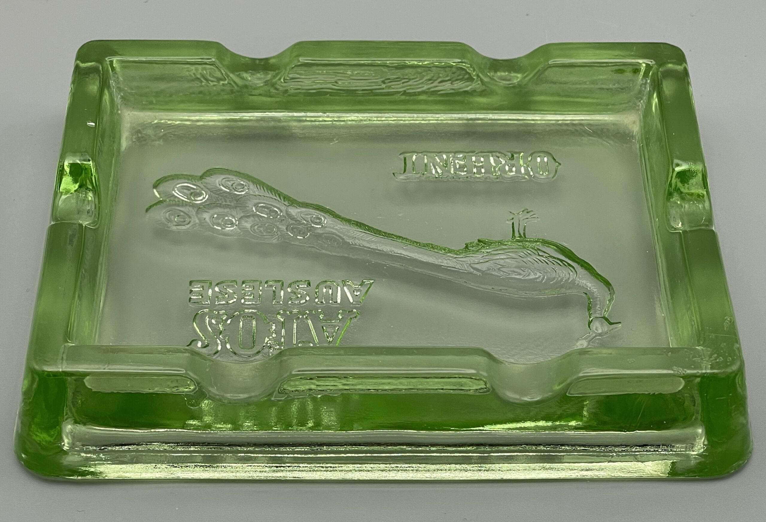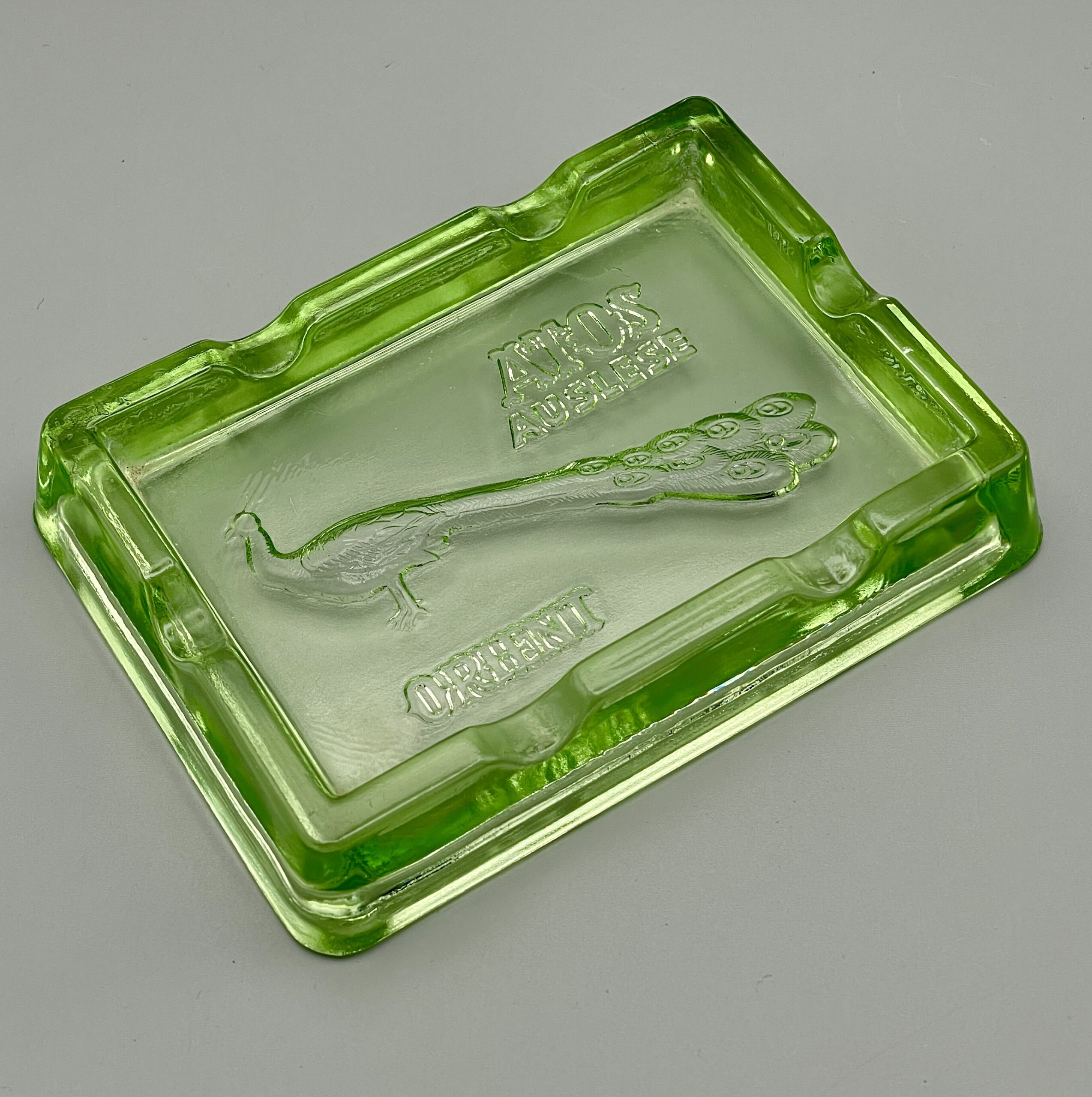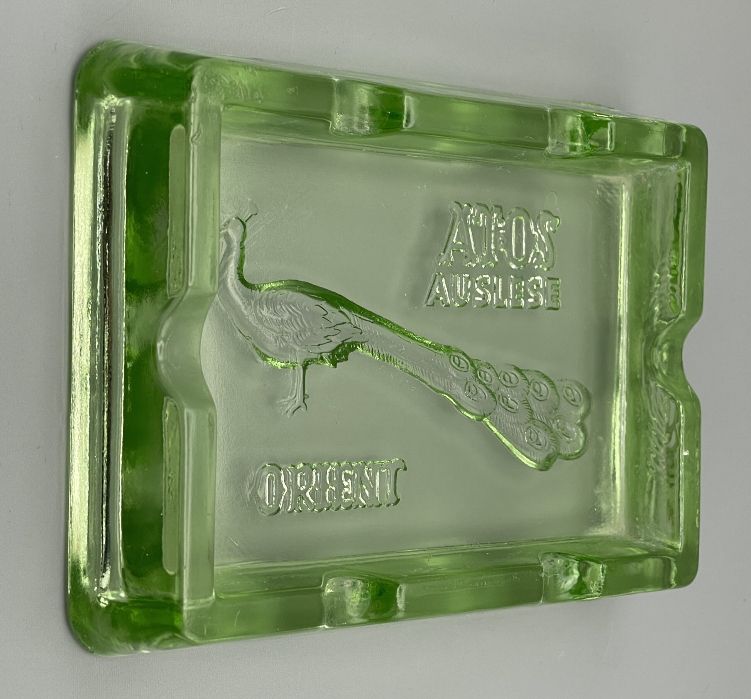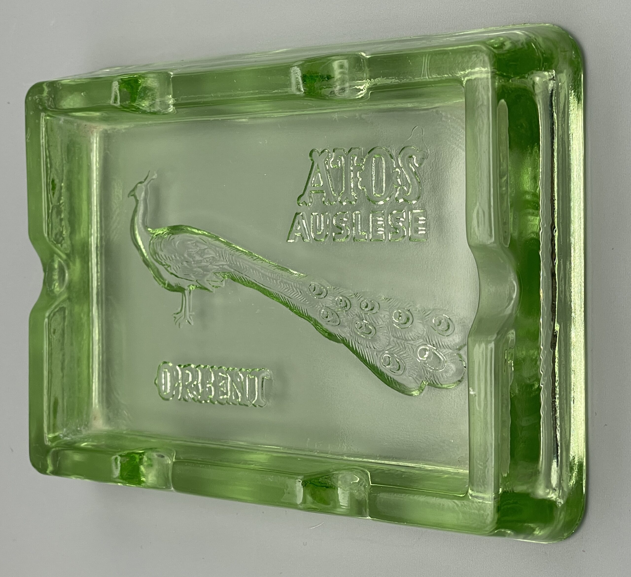 Alter Ascher mit Pfauenmotiv. Reklame für die Zigaretten-Marke ATOS AUSLESE ORIENT. Ca. 14 x 11 cm. Sehr guter Zustand. Grünes Pressglas. Siehe Bilder!