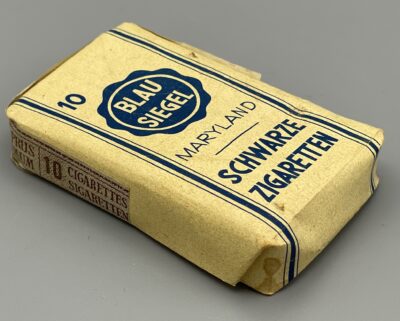 Seltene Zigarettenpackung aus der Zeit um 1930/40 mit 10 Cigaretten der Marke Blausiegel Maryland aus der Zigaretten-Fabrik Rotsiegel in Luxemburg (F. und M. Cahen). Zustand: ungeöffnet, mit Gebrauchsspuren.