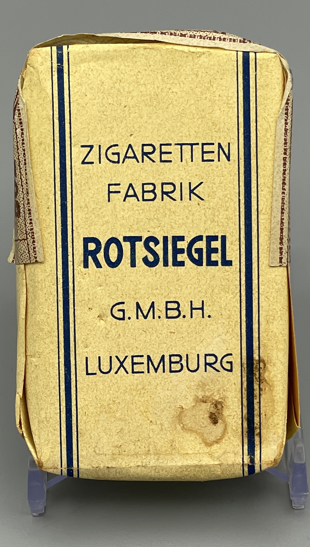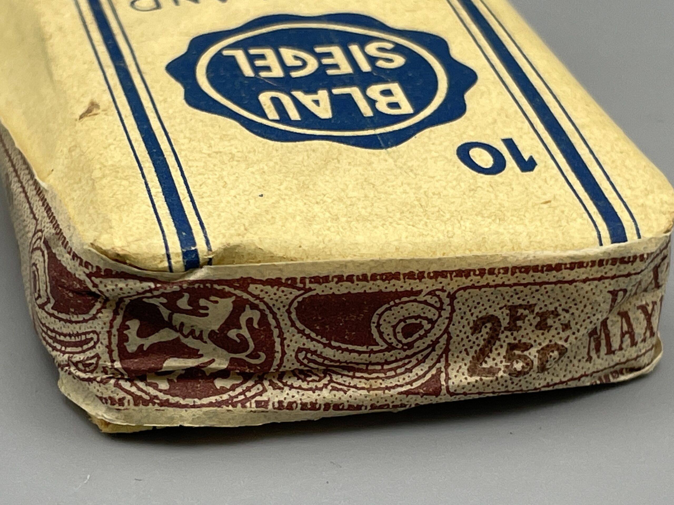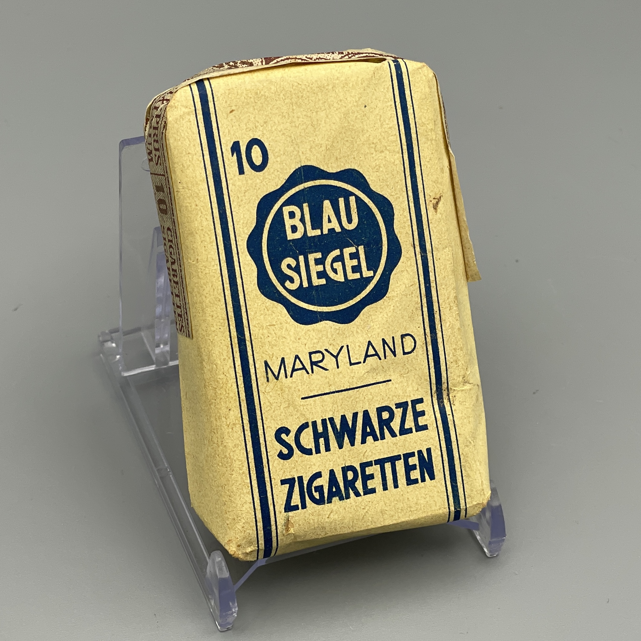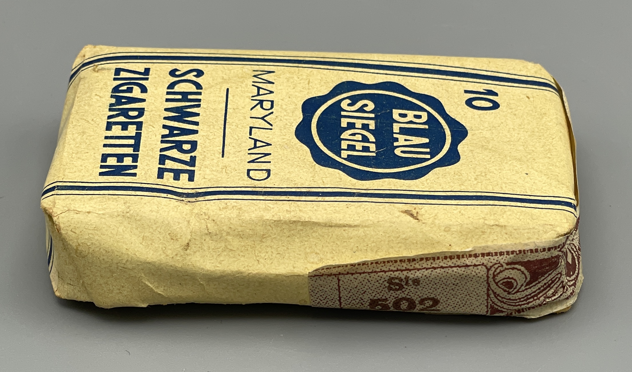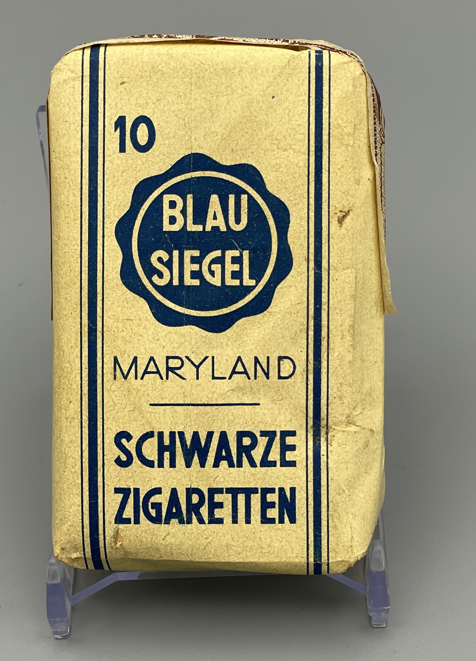 Seltene Zigarettenpackung aus der Zeit um 1930/40 mit 10 Cigaretten der Marke Blausiegel Maryland aus der Zigaretten-Fabrik Rotsiegel in Luxemburg (F. und M. Cahen). Zustand: ungeöffnet, mit Gebrauchsspuren.