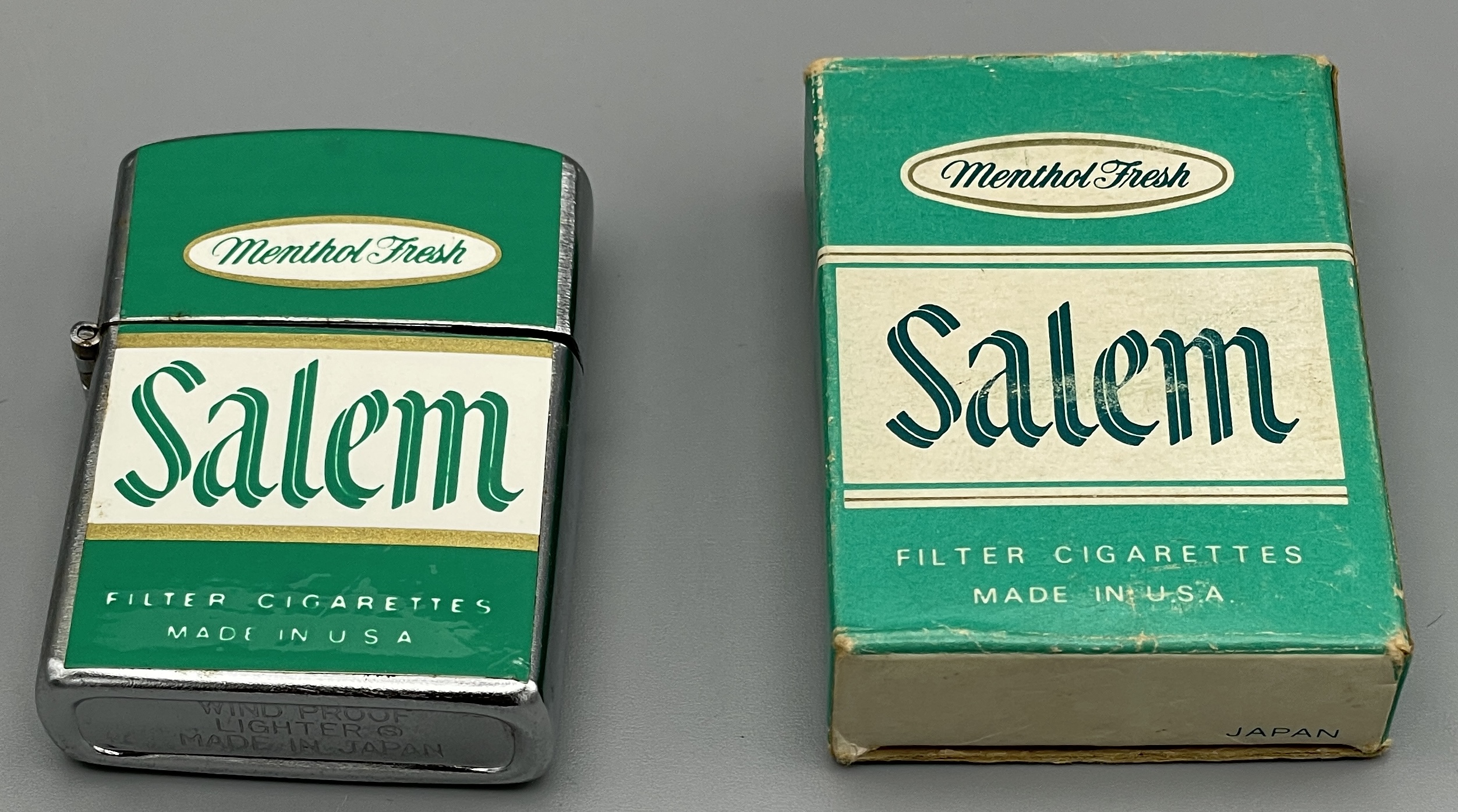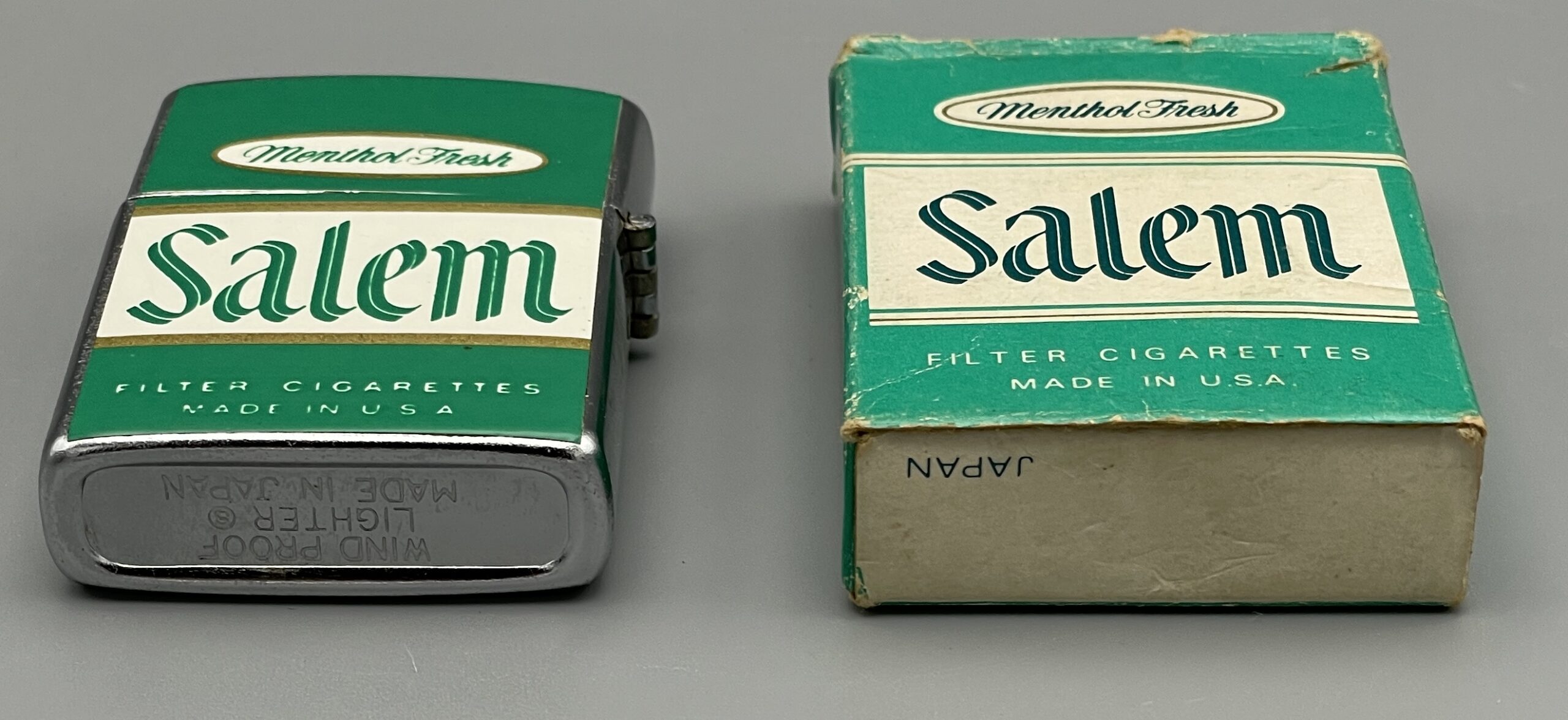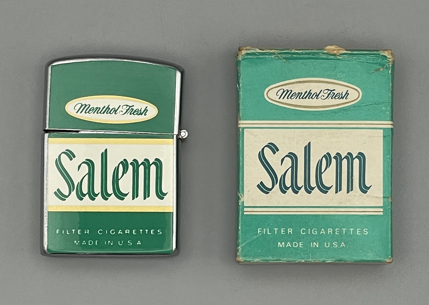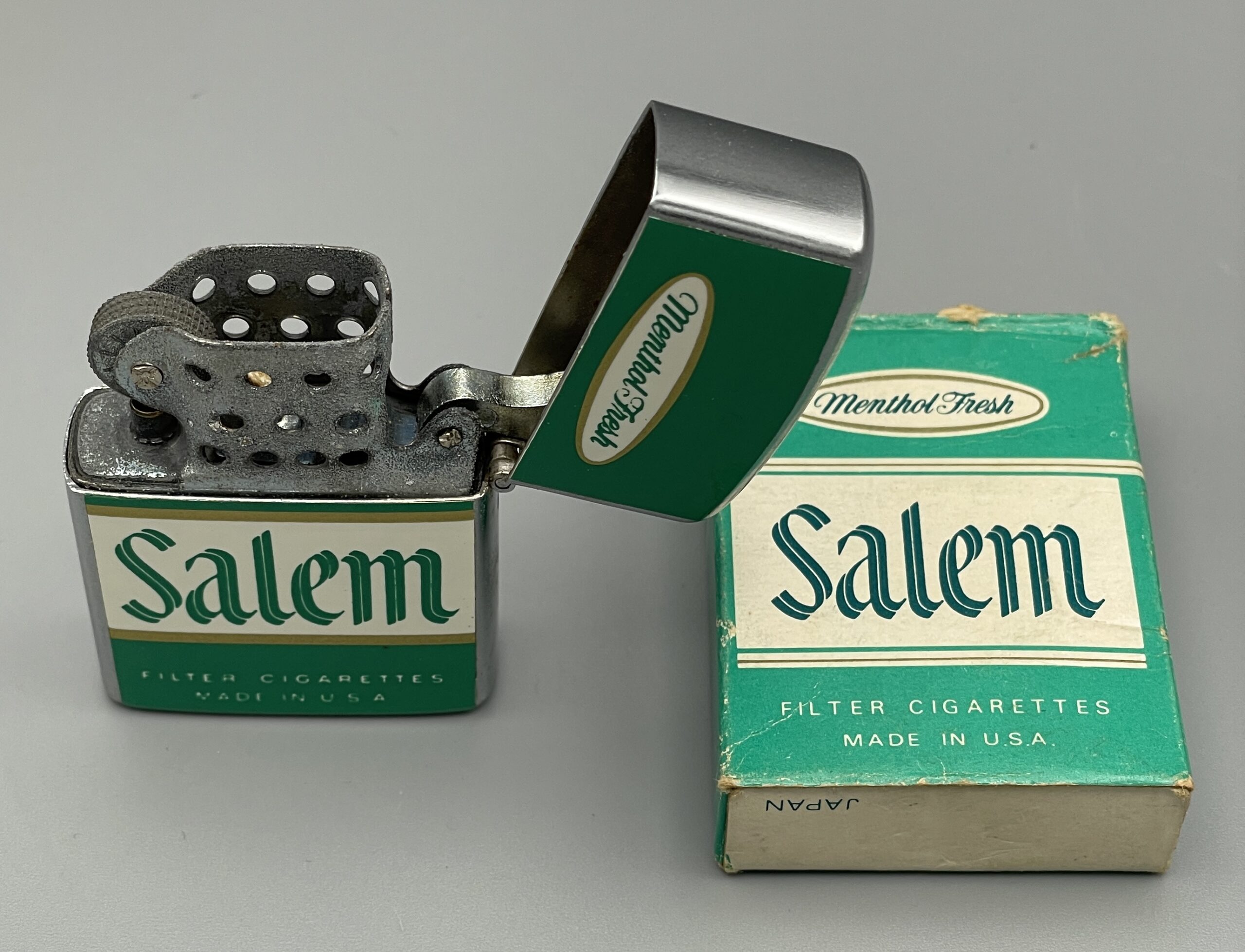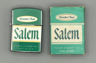 Altes Reklame-Feuerzeug mit Werbung für die Zigarettenmarke SALEM aus den USA: Salem wurde 1956 von der R.J. Reynolds Tobacco Company als die erste Mentholzigarette mit Filter eingeführt.