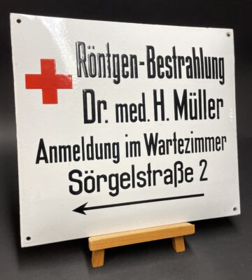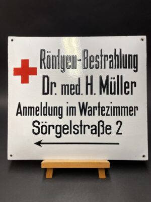 45 x 40 cm groß, schwere, gewölbte Trägerplatte und fette, zuckergussartige Emaillierung. Imposantes Hinweisschild auf die Röntgen-Praxis eines Dr. H. Müller aus der Sörgelstraße 2, höchstwahrscheinlich in München.