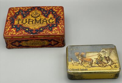 Blechdose für 100 Zigaretten der Sorte TURMAC ORANGE. Sehr schöner Zustand. Ca. 14,5 x 11,5 x 4 cm. Dazu eine etwas kleinere Crüwell-Tabakdose. Altersgemäßer Zustand: Siehe Bilder!