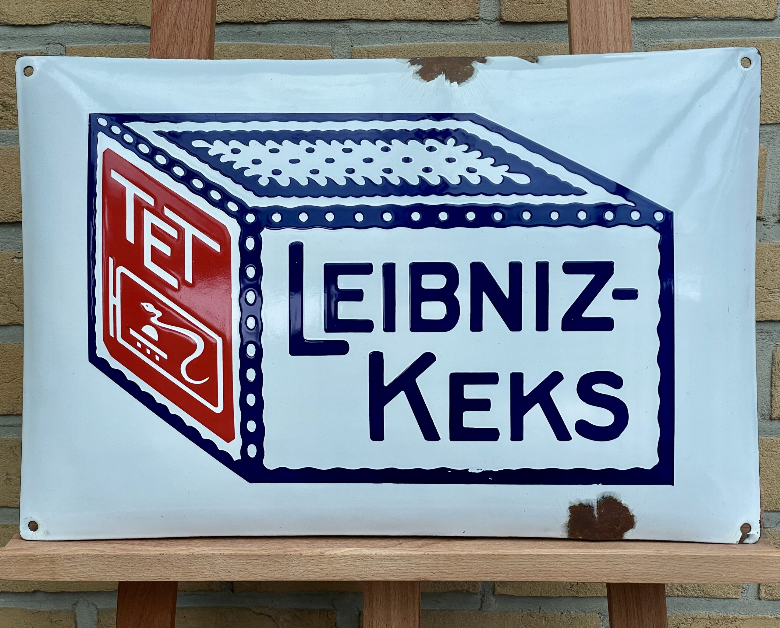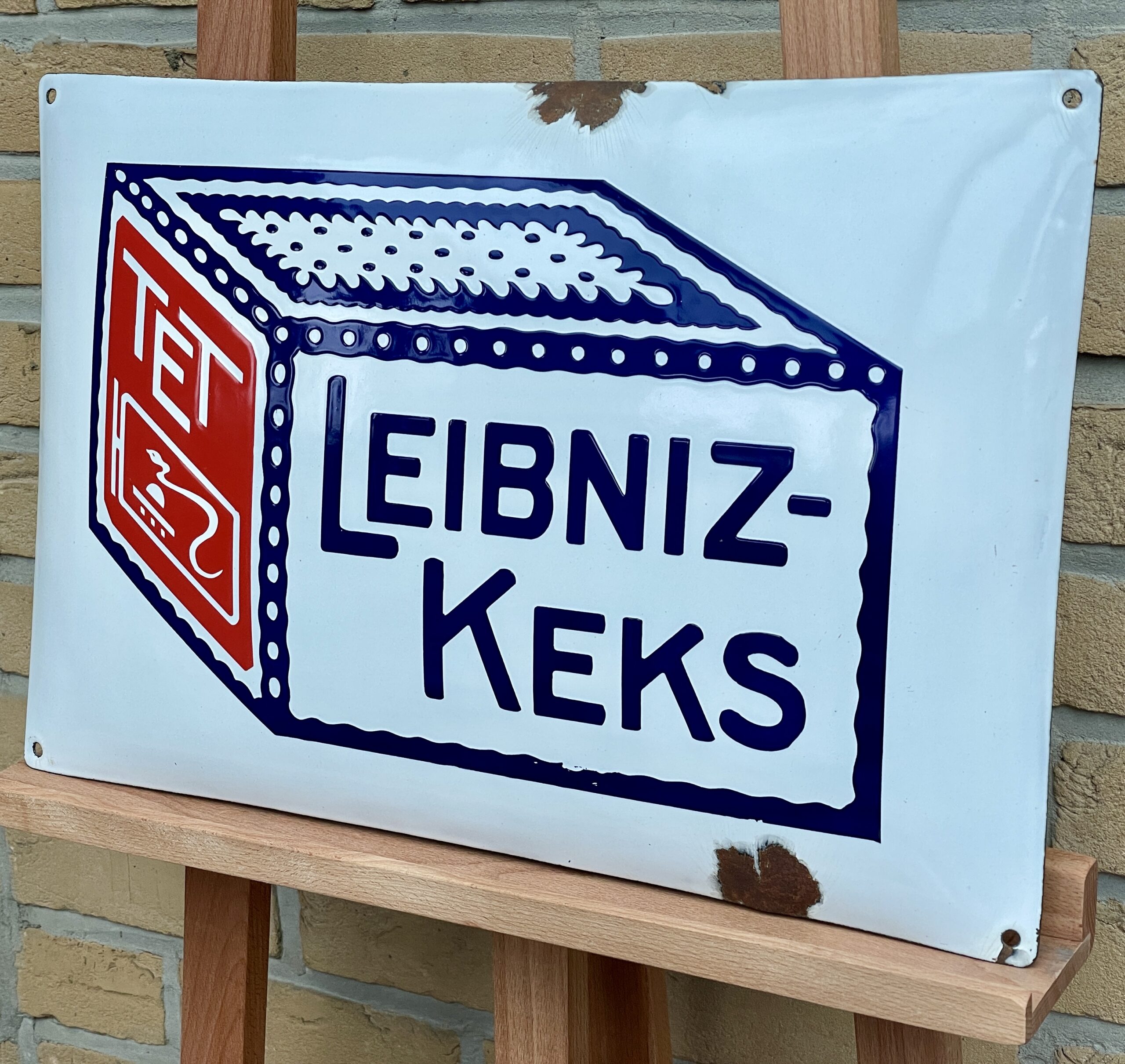 LEIBNIZ KEKS (TET): Seltenes Emailschild mit Reklame für den legendären Bahlsen-Keks aus der Zeit um 1920, nach einem Entwurf von Robert Fricke.
