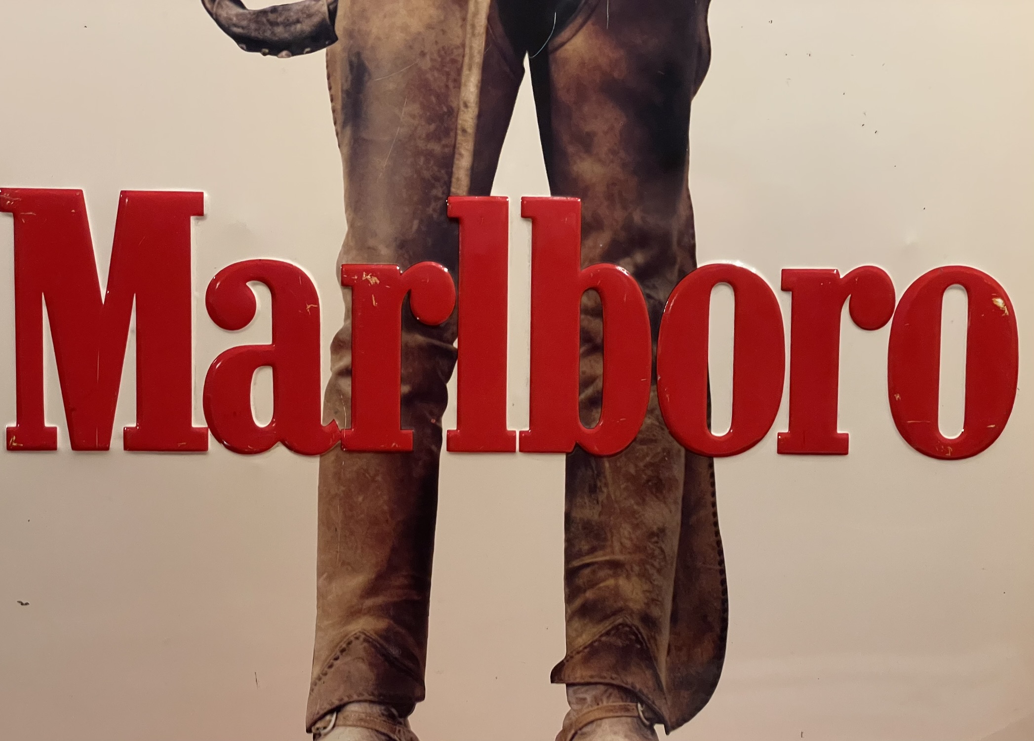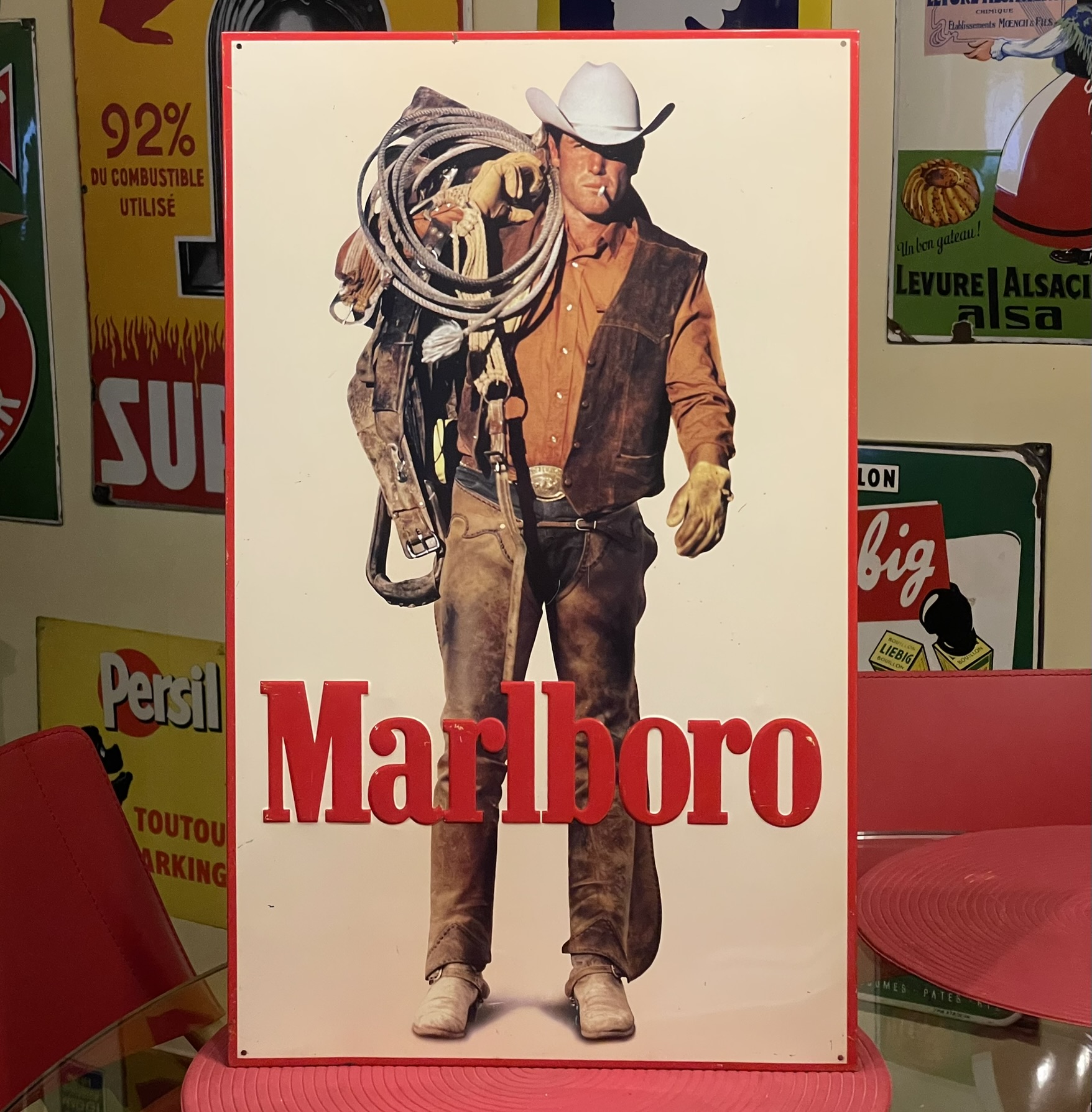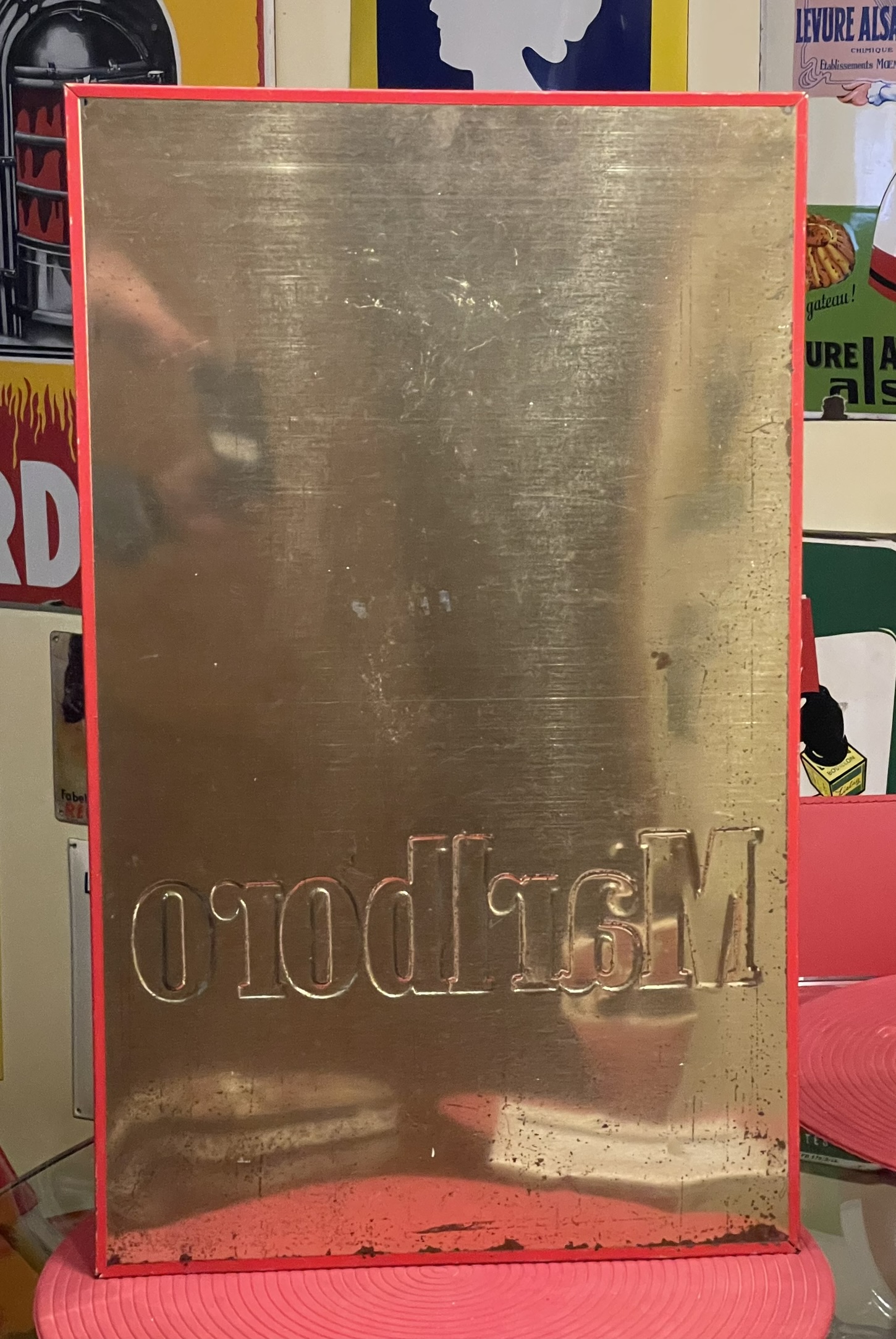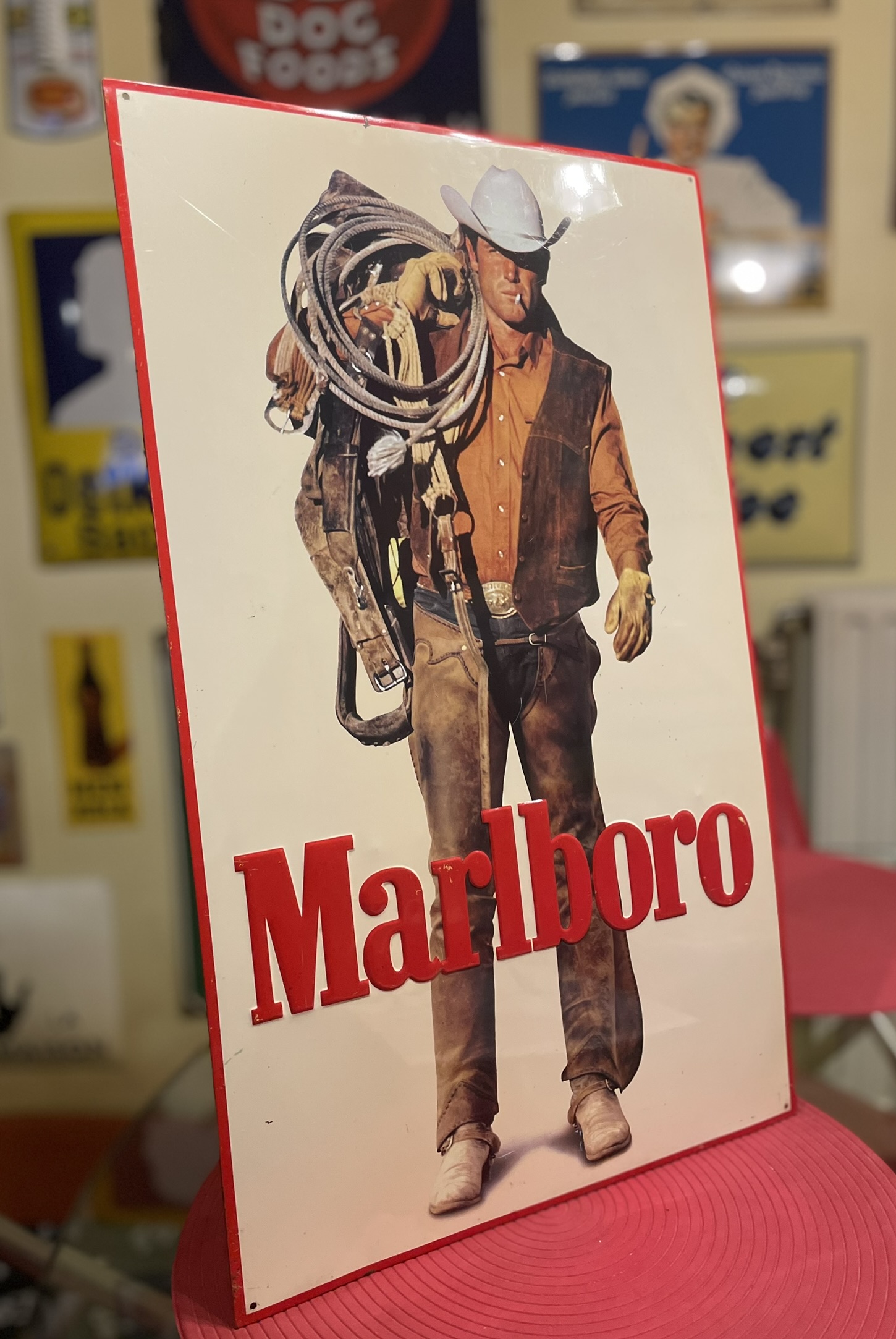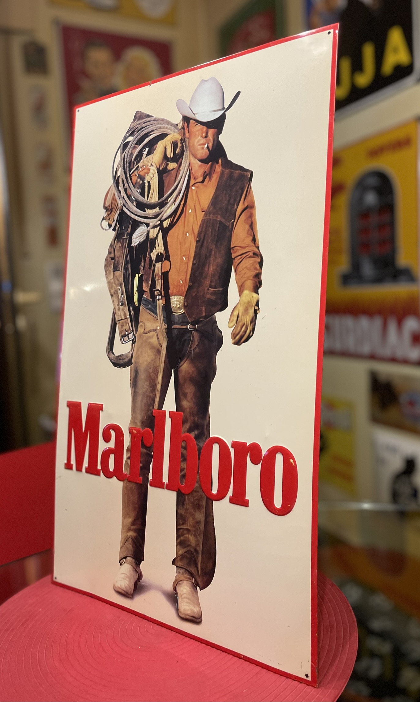 Blechschild mit stark geprägtem Marlboro-Schriftzug. Flach, gefalzter Rand. Ca. 54 x 33 cm groß.