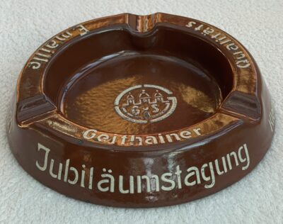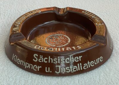 Seltener Reklameascher aus dick schablonierter Emaille mit Reklame für das heute noch existierende Unternehmen Geithainer Emaillierwerk (siehe: geo-geithain.de). Gegründet wurde das Werk 1898. Im Jahr 1900 übernahm es den Namen Gräßler & Schmidt. Das Logo G & S findet sich im Spiegel des Ascher und auf dem Unterboden.