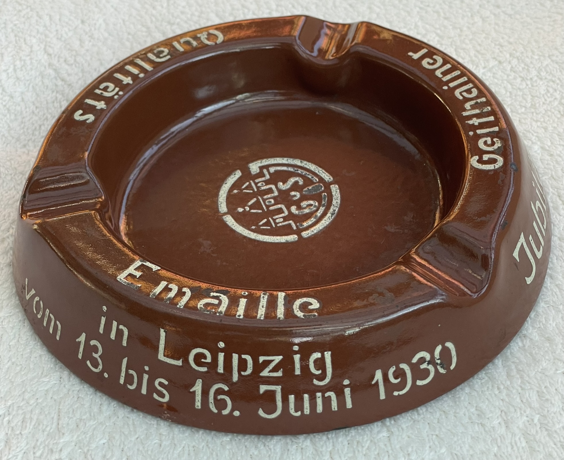 Beschriftung oben am Rand: “Geithainer Qualitäts Emaille”. Des weiteren umlaufend an den Seiten “Jubiläumstagung Sächsischer Klempner u. Installateure – in Leipzig vom 13. bis 16. Juni 1930”.