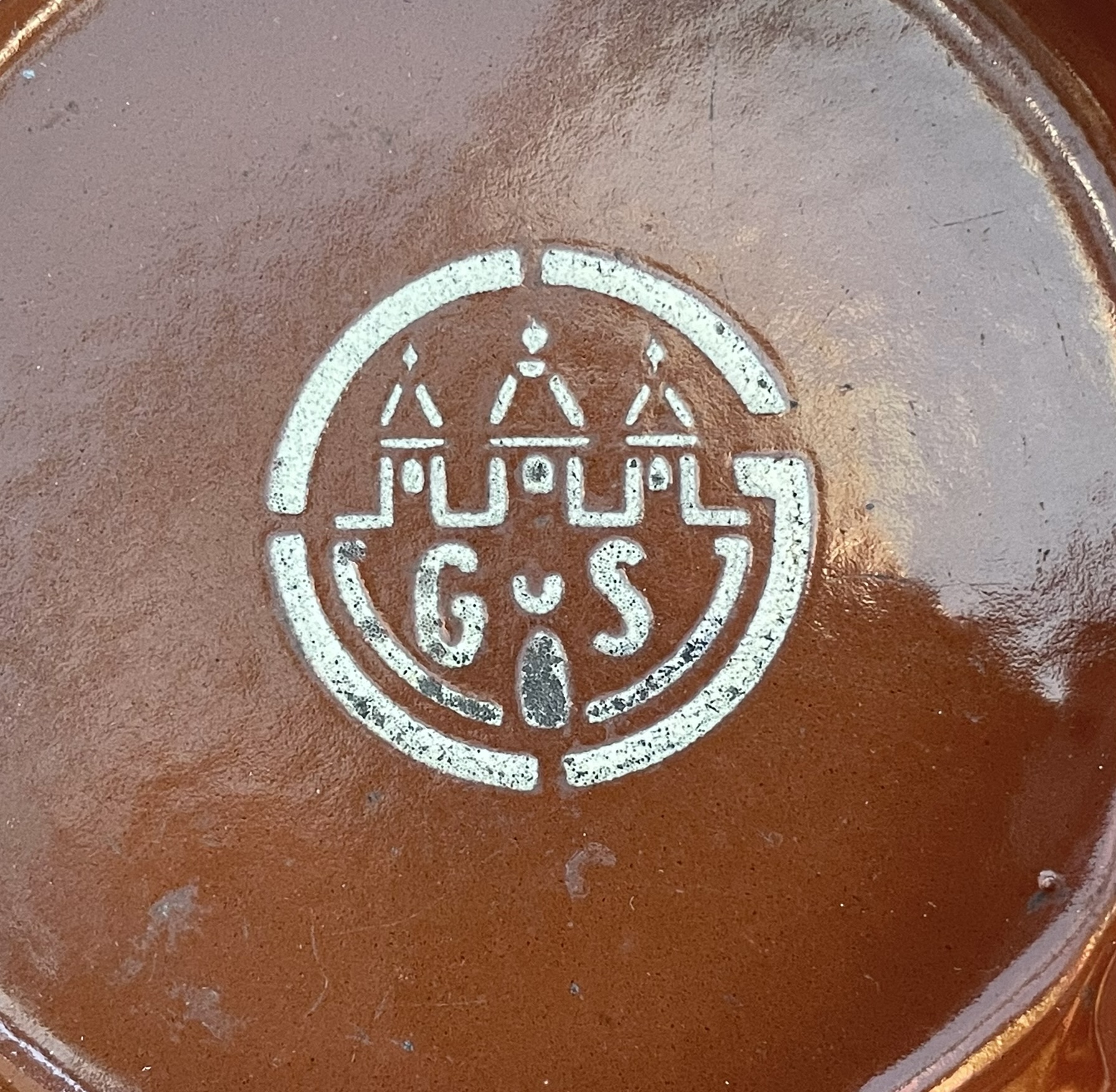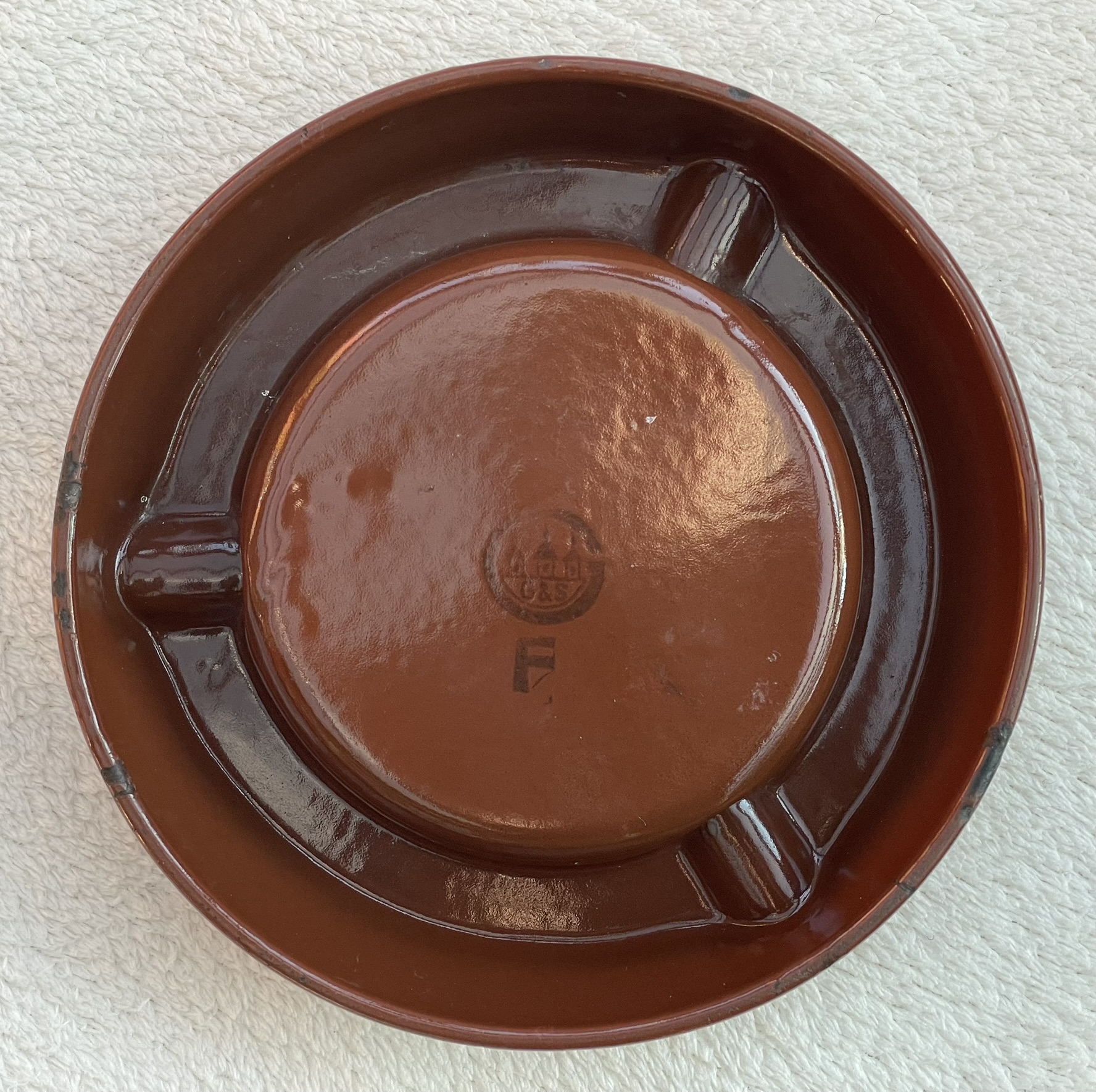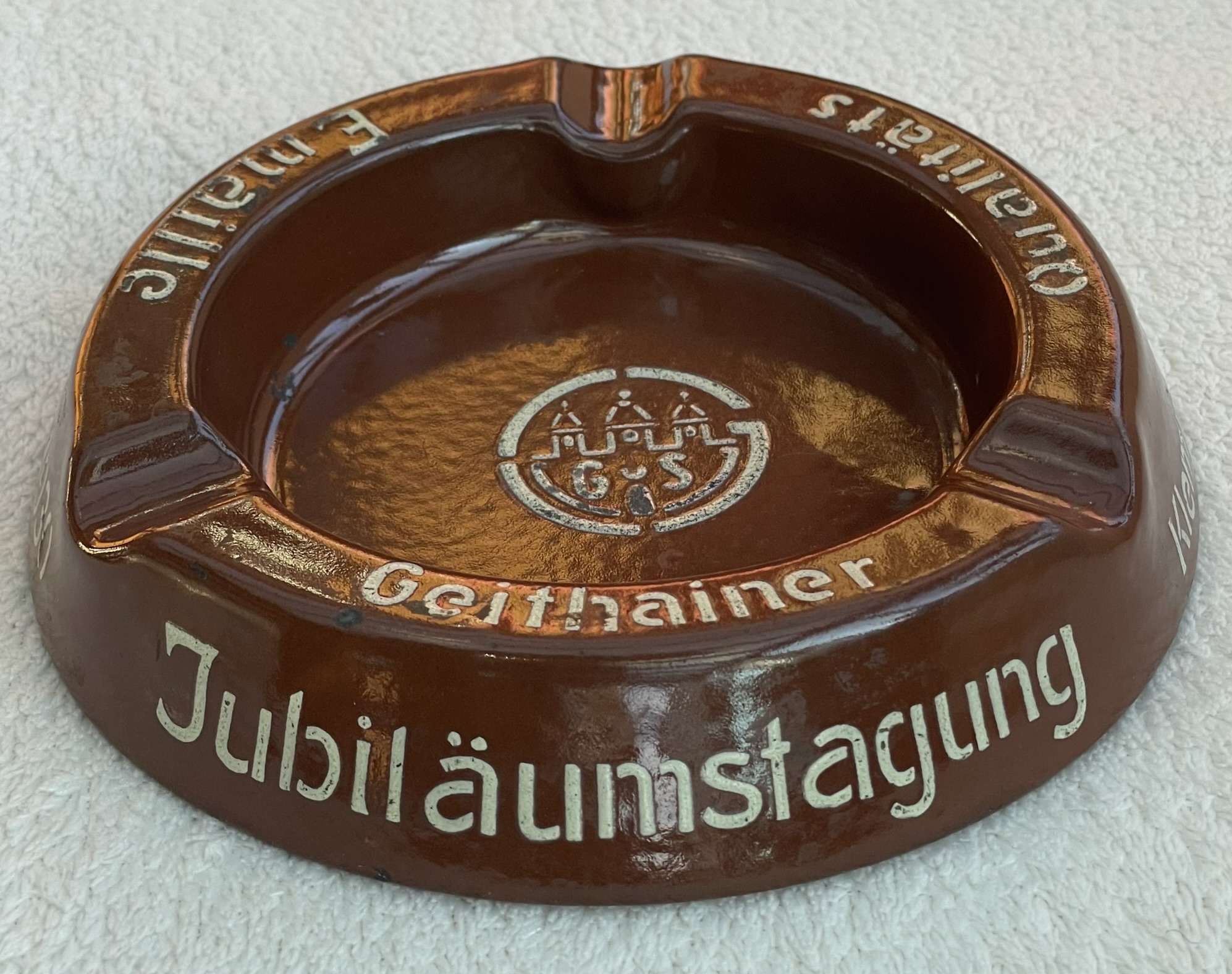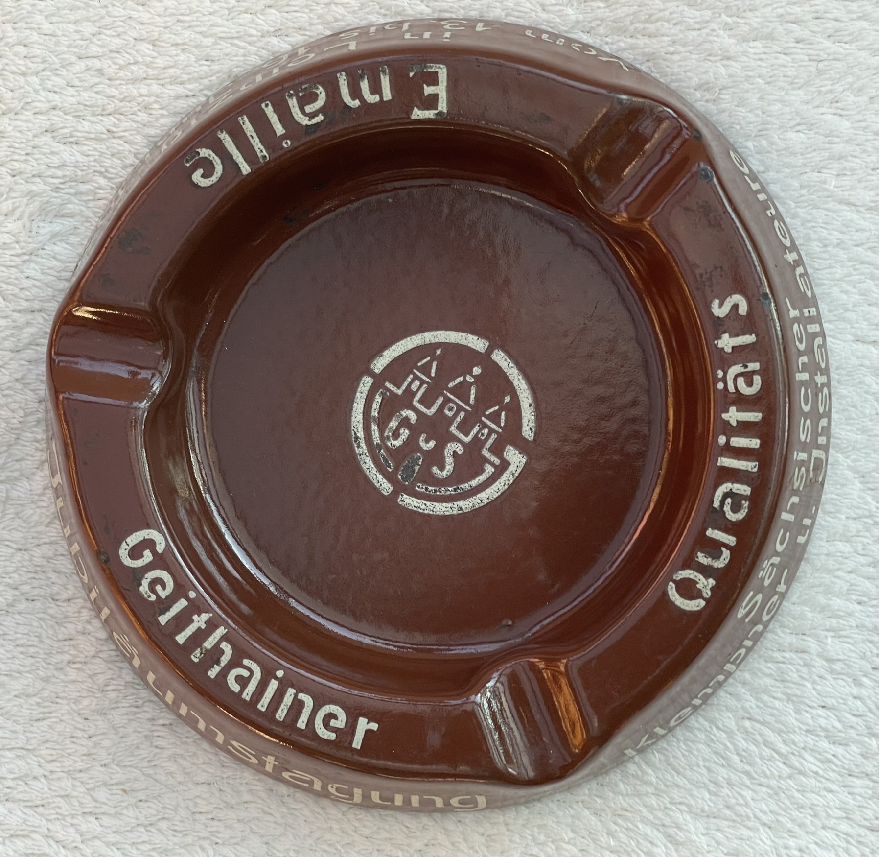Seltener Reklameascher aus dick schablonierter Emaille mit Reklame für das heute noch existierende Unternehmen Geithainer Emaillierwerk (siehe: geo-geithain.de). Gegründet wurde das Werk 1898. Im Jahr 1900 übernahm es den Namen Gräßler & Schmidt. Das Logo G & S findet sich im Spiegel des Ascher und auf dem Unterboden.