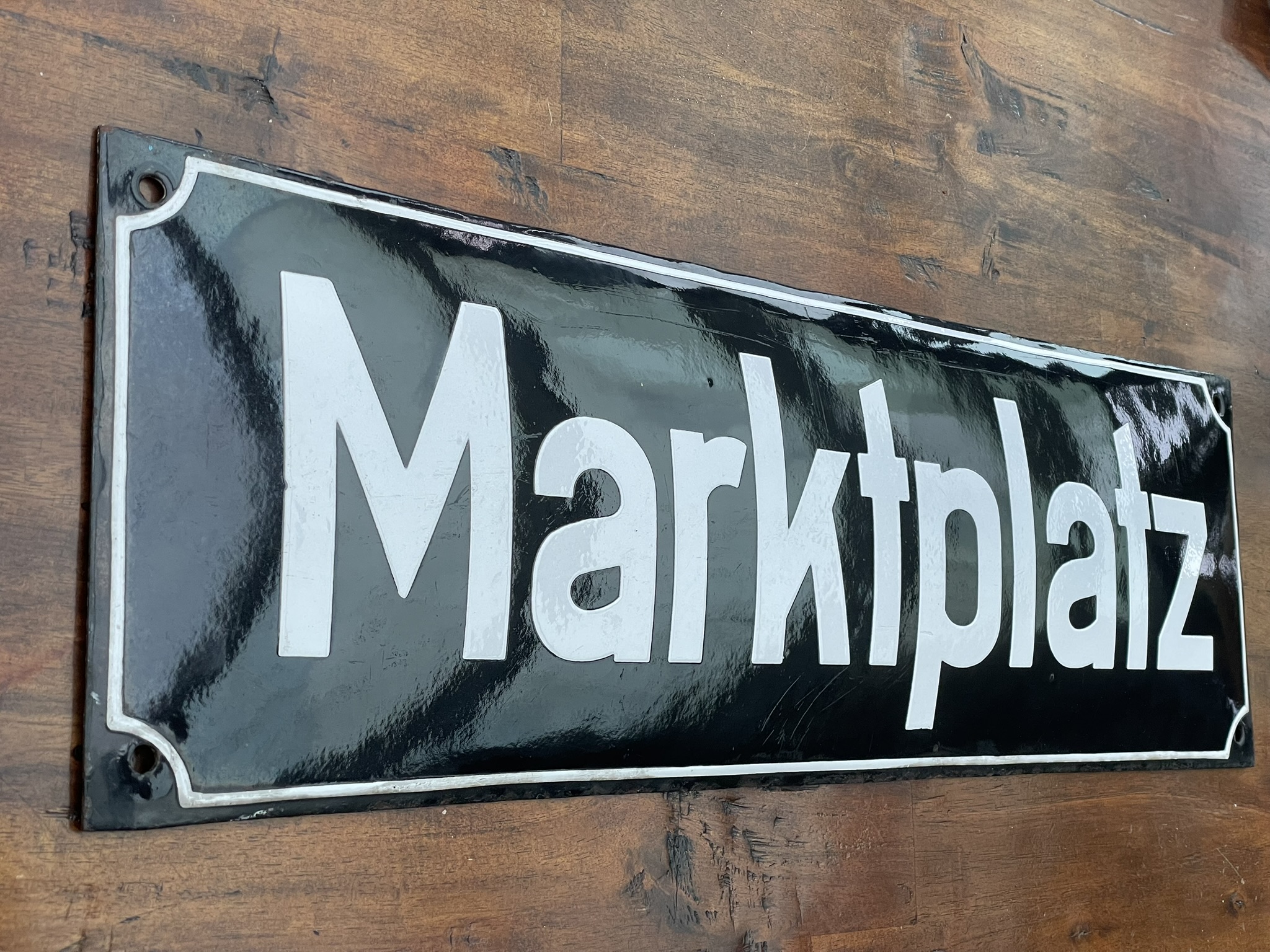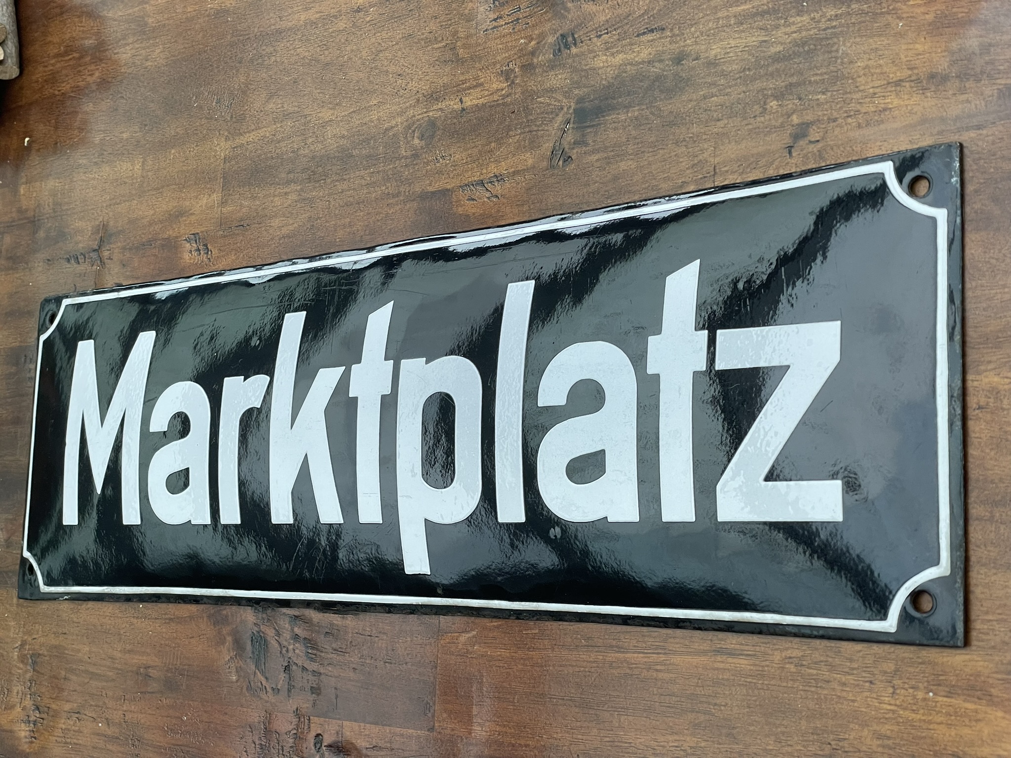 Altes Original-Emailschild, um 1930, schweres Trägermaterial, fett emailliert: MARKTPLATZ, weiße Lettern auf schwarzem Grund. Einzelne Altersspuren, doch eine hochglänzende Oberfläche! Gewölbt, ca. 58 x 18 cm.